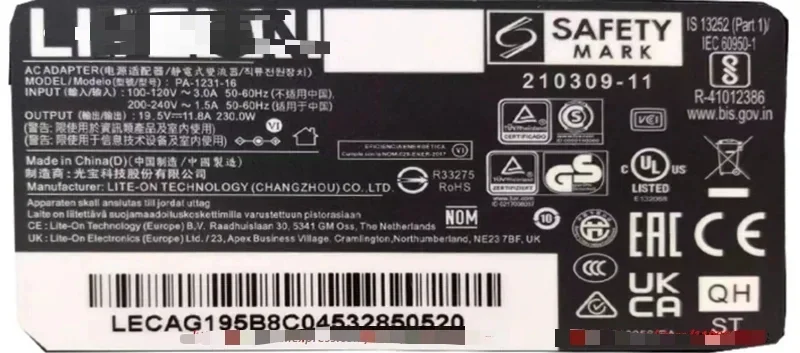 정품 LiteOn PA123116 POWER LOGIC 공급 장치 19.5v 11.8a 230W AC 어댑터 노트북 충전기 PA123112 7.4*5.0mm 팁 원본
