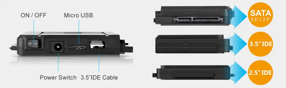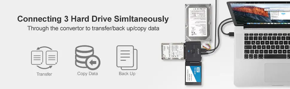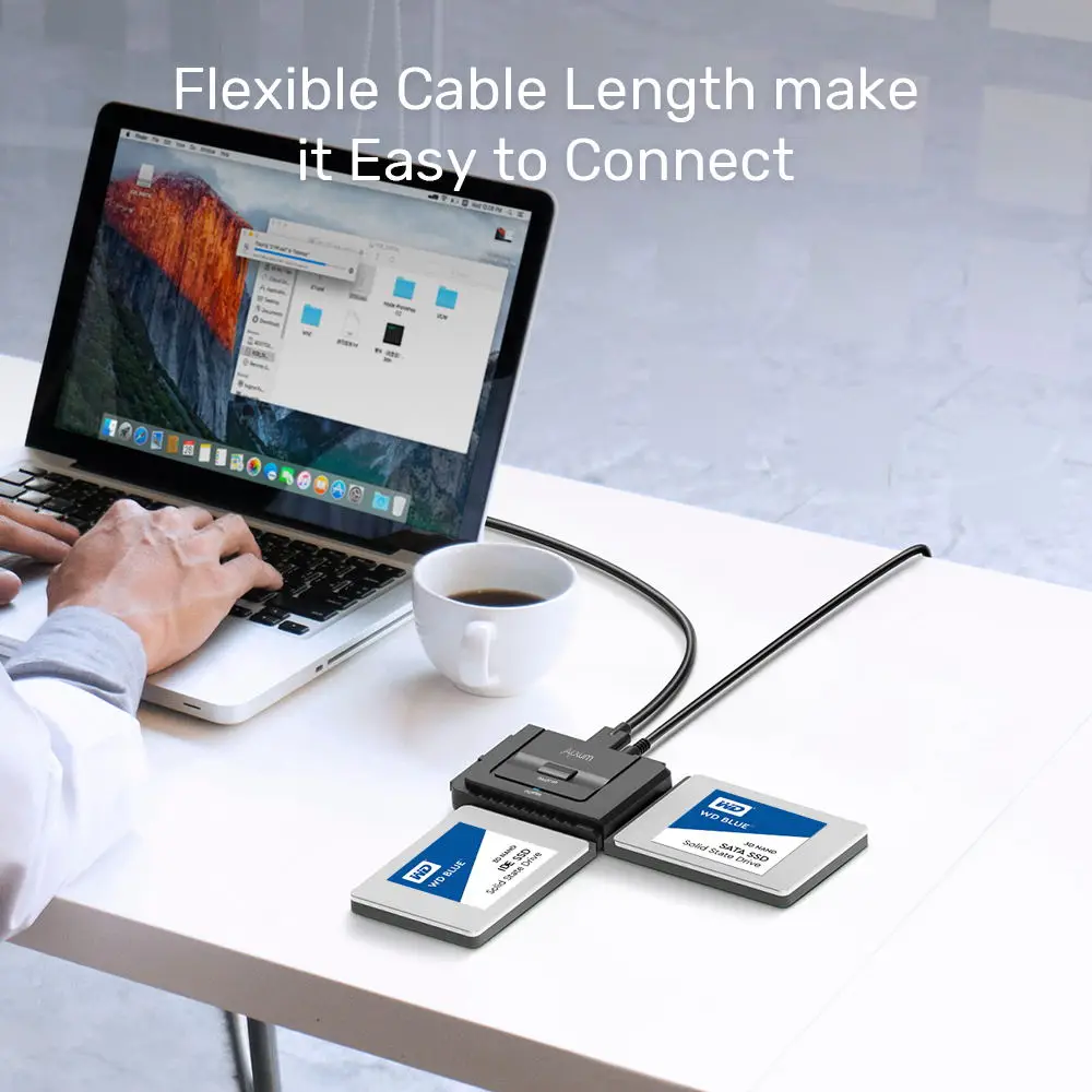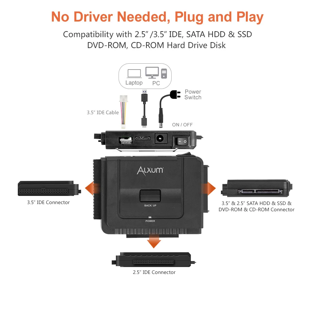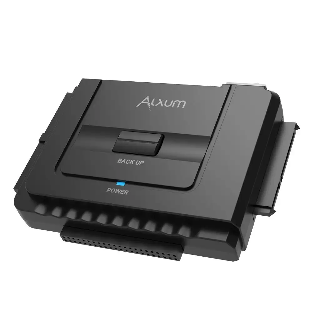 Alxum 하드 드라이브 어댑터는 2.5인치/3.5인치 IDE/SATA 하드 드라이브의 데이터 전송 및 백업을 위한 완벽한 솔루션으로, 최대 18TB까지 최대 3개의 드라이브를 동시에 지원합니다.