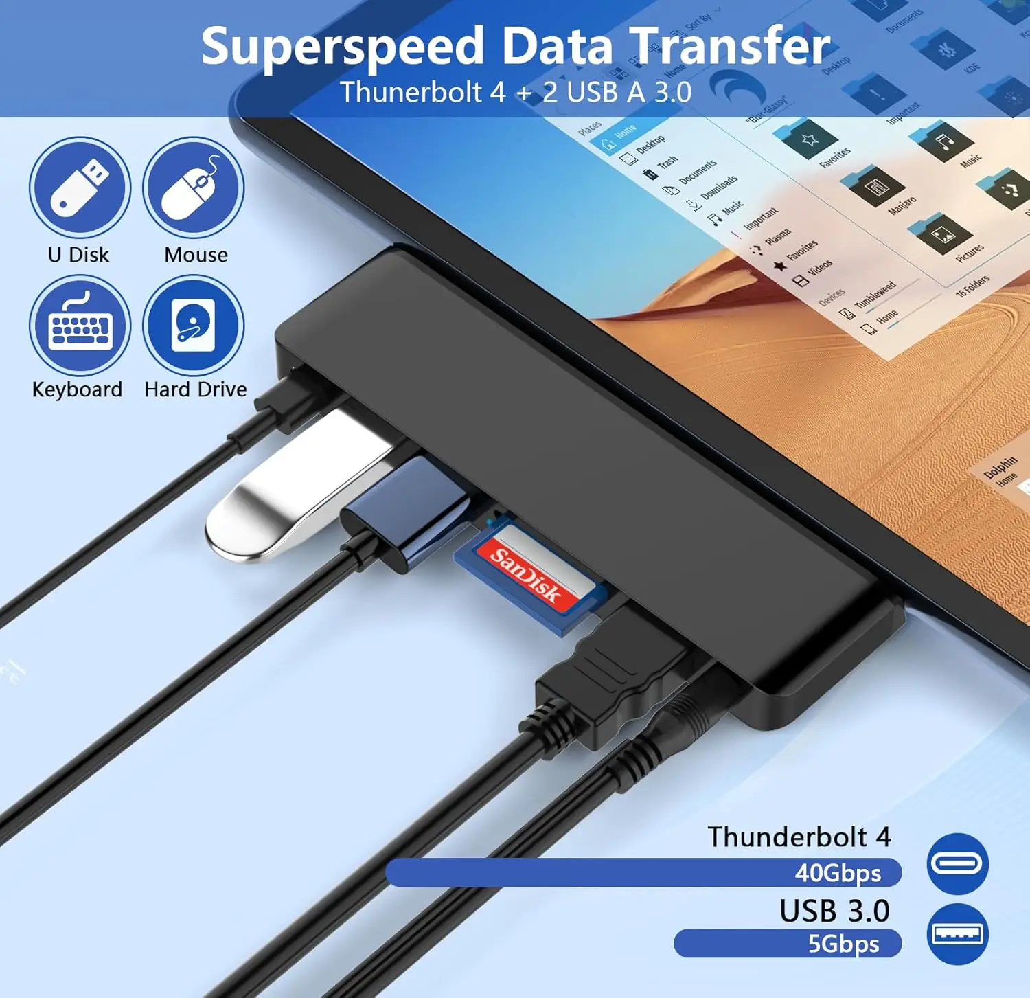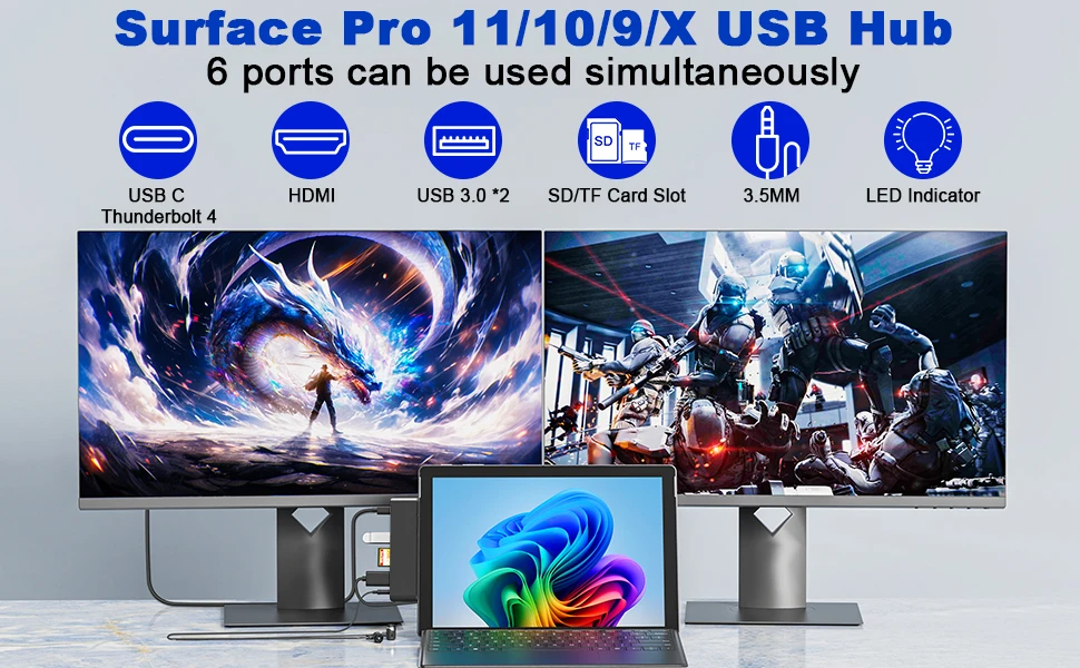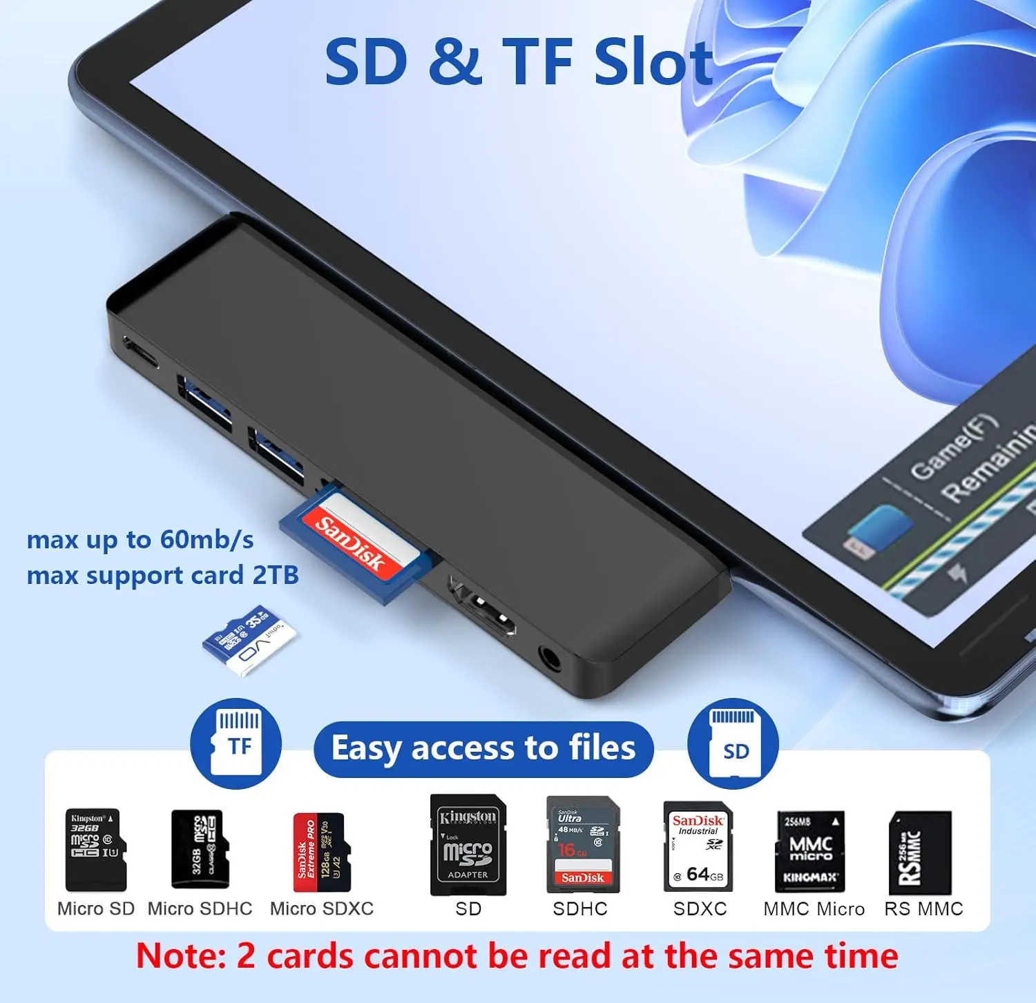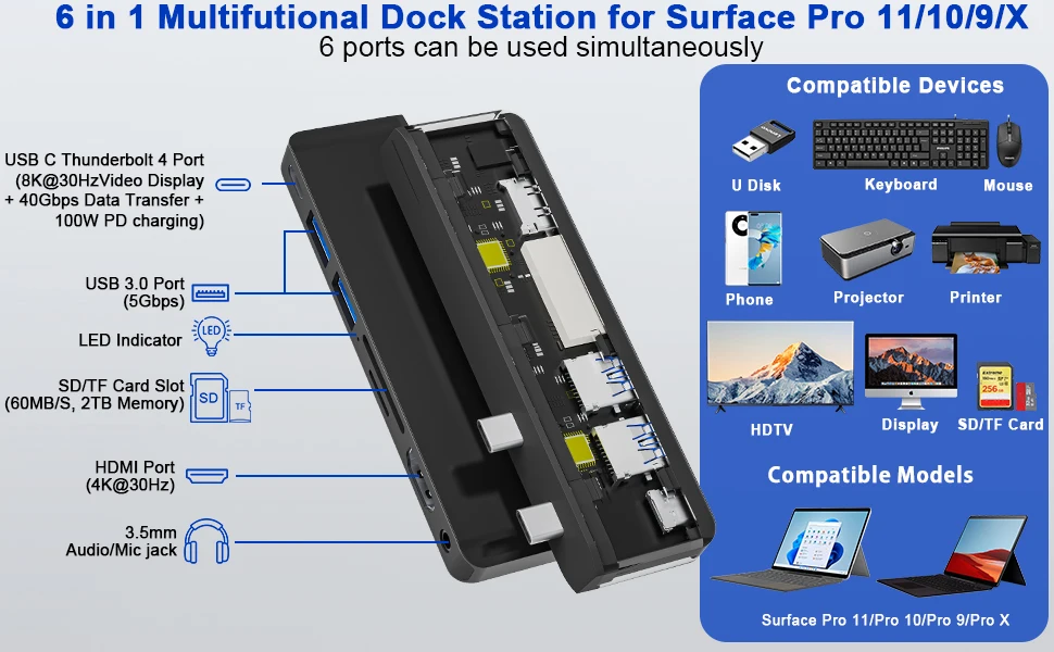 Surface pro 11 멀티포트 허브 스테이션 변환 허브에는 6개의 포트를 동시에 구동하고 사용할 수 있는 다기능 포트가 있습니다.