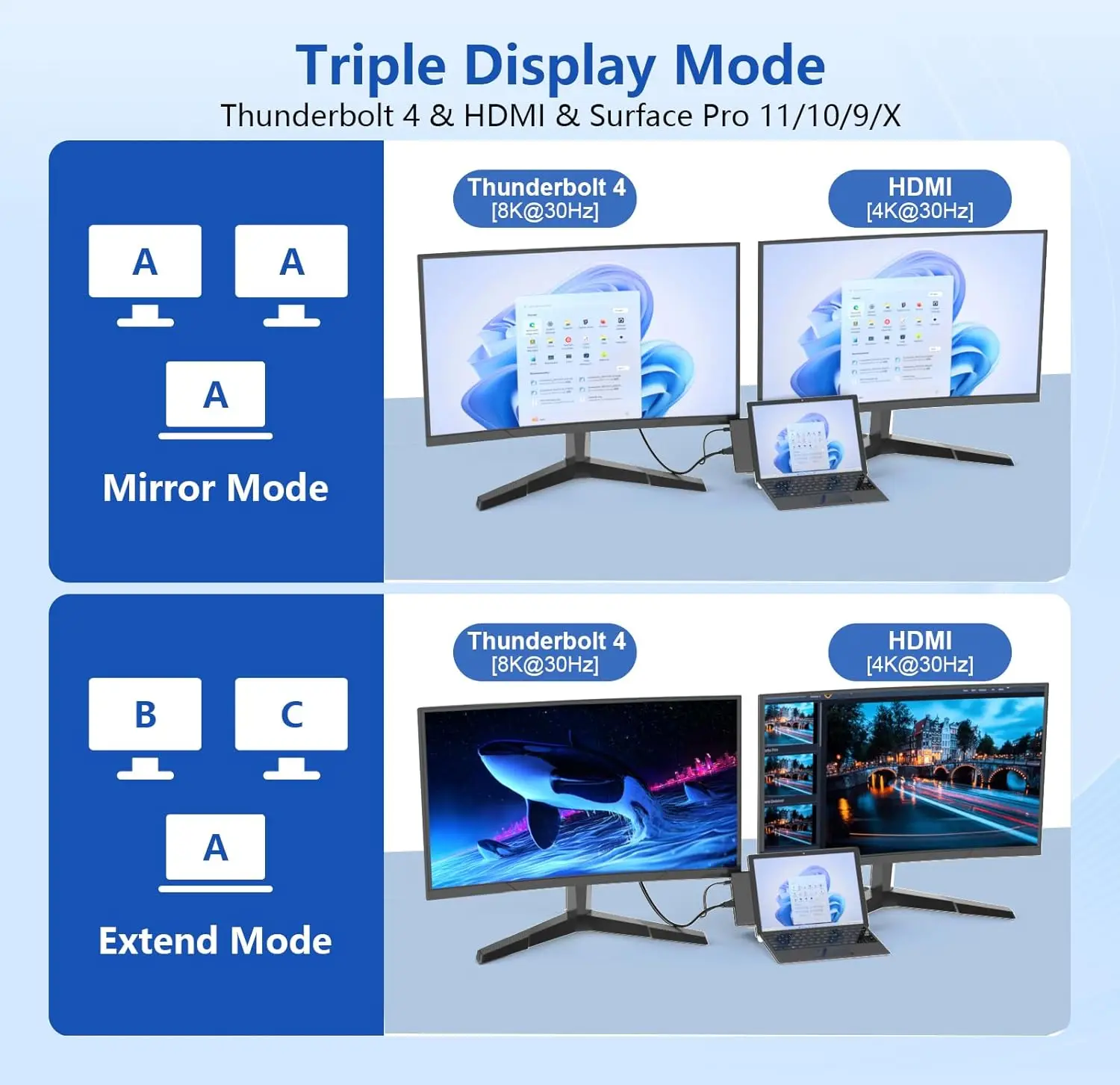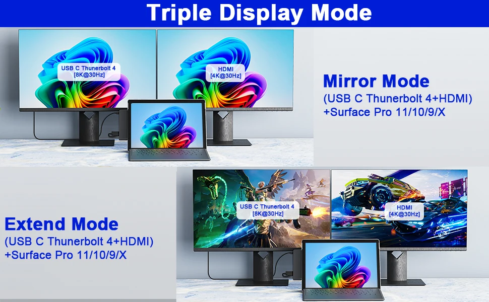 Surface Pro 10 HDMI 어댑터의 USB C Thunderbolt 4 포트에 디스플레이를 연결하기만 하면 8K@30Hz 해상도, 고화질, 대기 시간 없음, 판지 상자 없음을 얻을 수 있습니다.