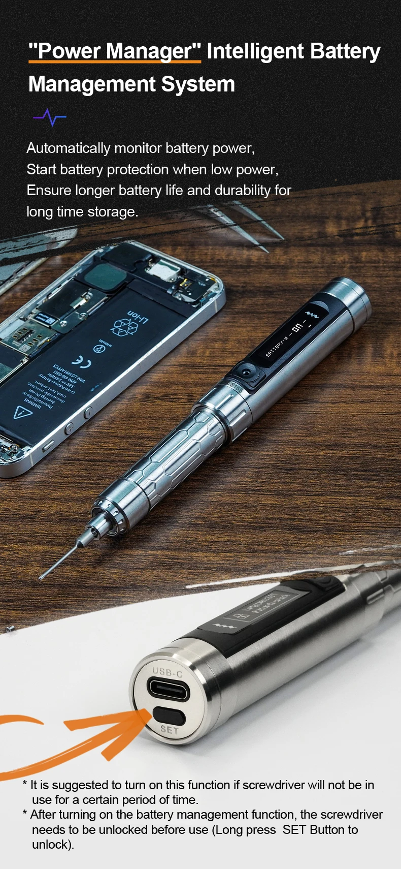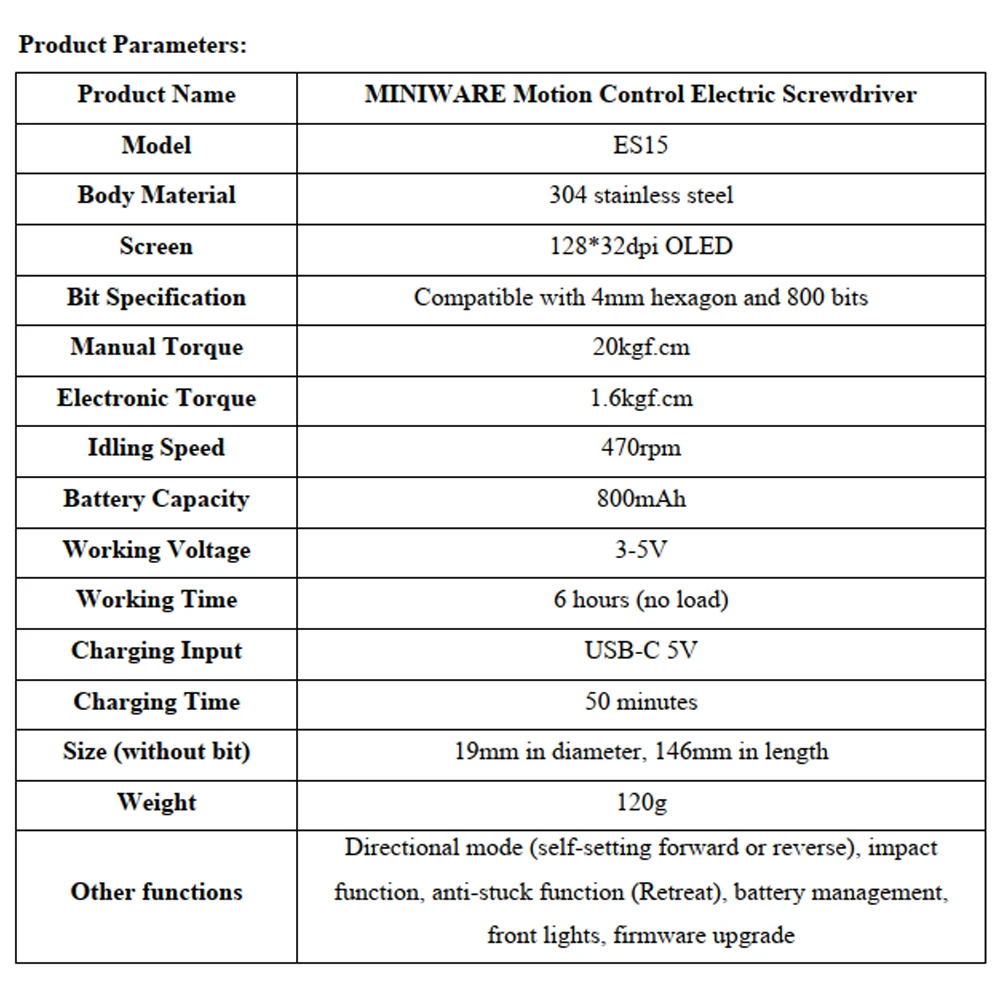ES15S 본체는 메인 제어 모듈과 POWER LOGIC 모듈의 두 그룹으로 나눌 수 있습니다.몸 전체는 304 스테인레스 스틸 쉘을 채택합니다.전면부에는 미끄럼 방지 패턴의 기술적 감각이 새겨져 있으며, 정교한 마감과 높은 품질을 자랑합니다.이전 세대 MINIWARE 체감형 전동 드라이버와 비교하여 ES15S는 더 큰 용량의 배터리와 OLED 화면을 갖추고 있어 더 긴 작업 시간을 지원하고 더 많은 작업 매개변수를 표시할 수 있습니다.또한 ES15는 다양한 지능형 기능과 작동 업그레이드도 제공합니다.