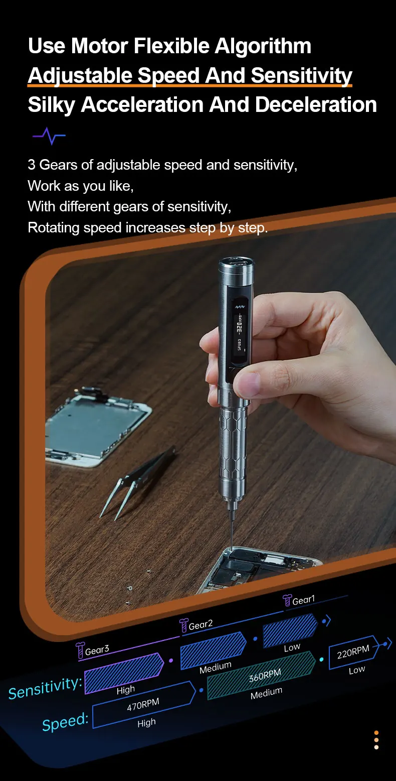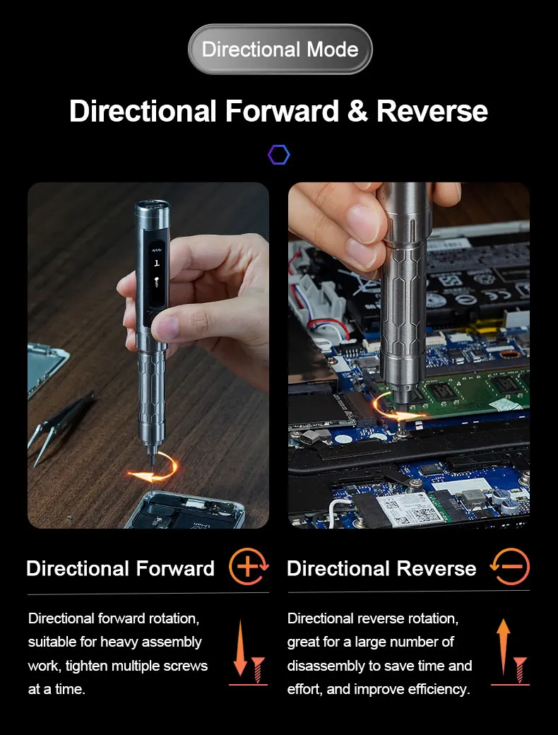 지능형 체감 인식 및 방향 모드: ES15S는 지능형 체감 인식 및 방향 모드(정방향 회전, 역방향 회전)의 다양한 작동 모드로 설정할 수 있습니다.체감 인식 기능은 빠른 유지 보수에 적합하며, 방향 모드는 고도의 분해 및 조립 작업에 사용됩니다.