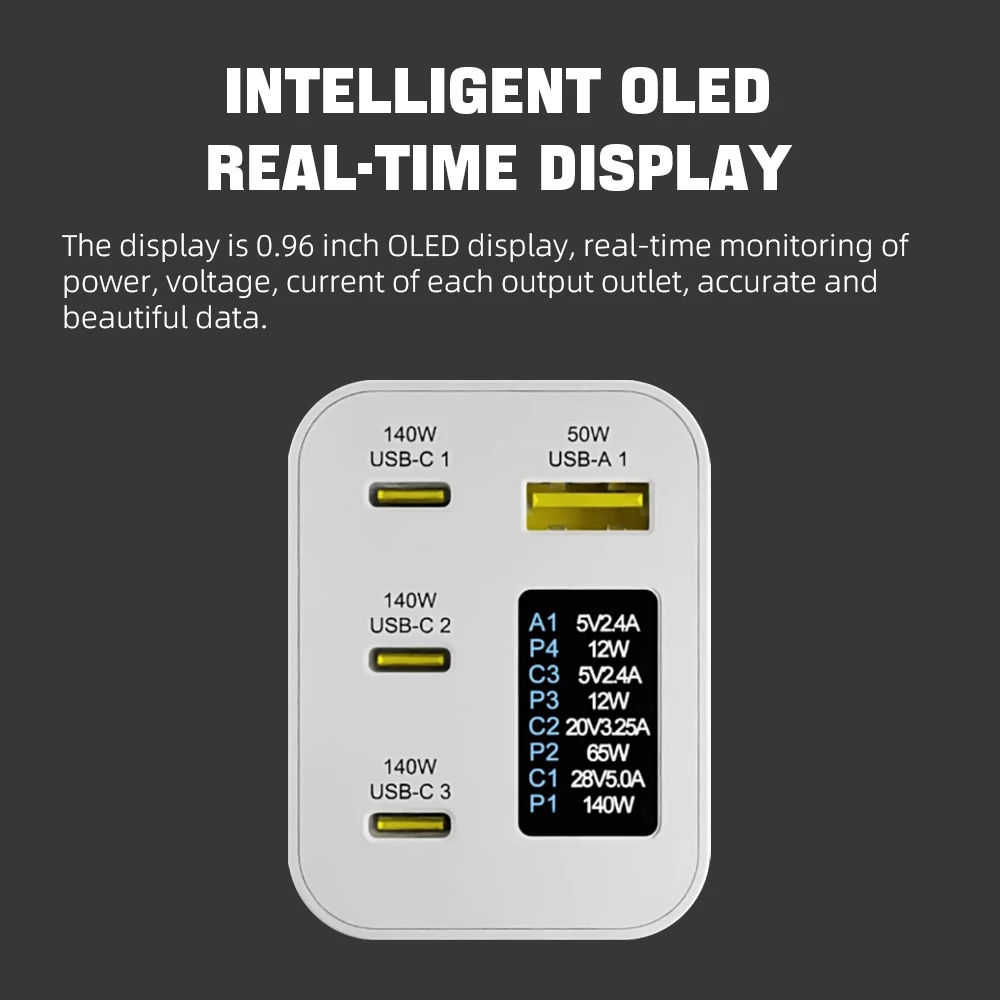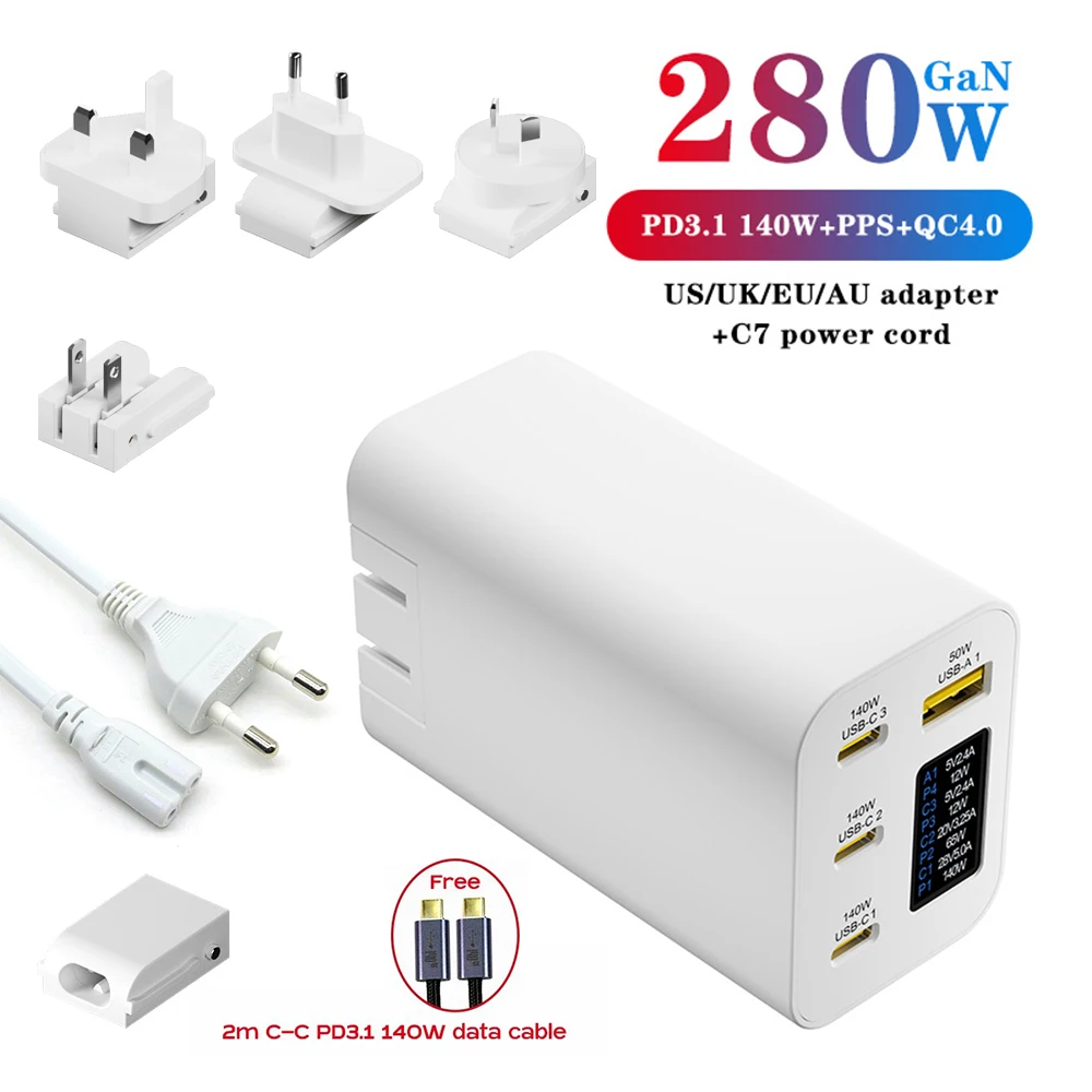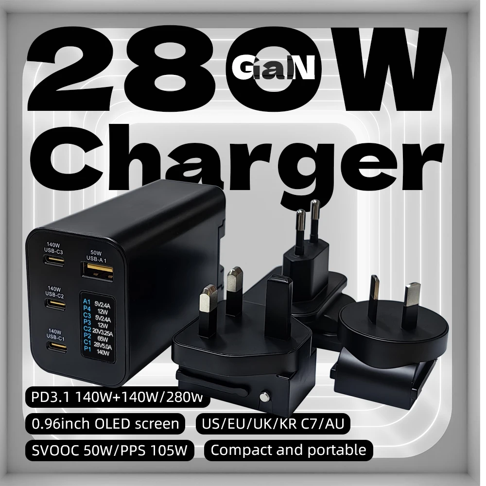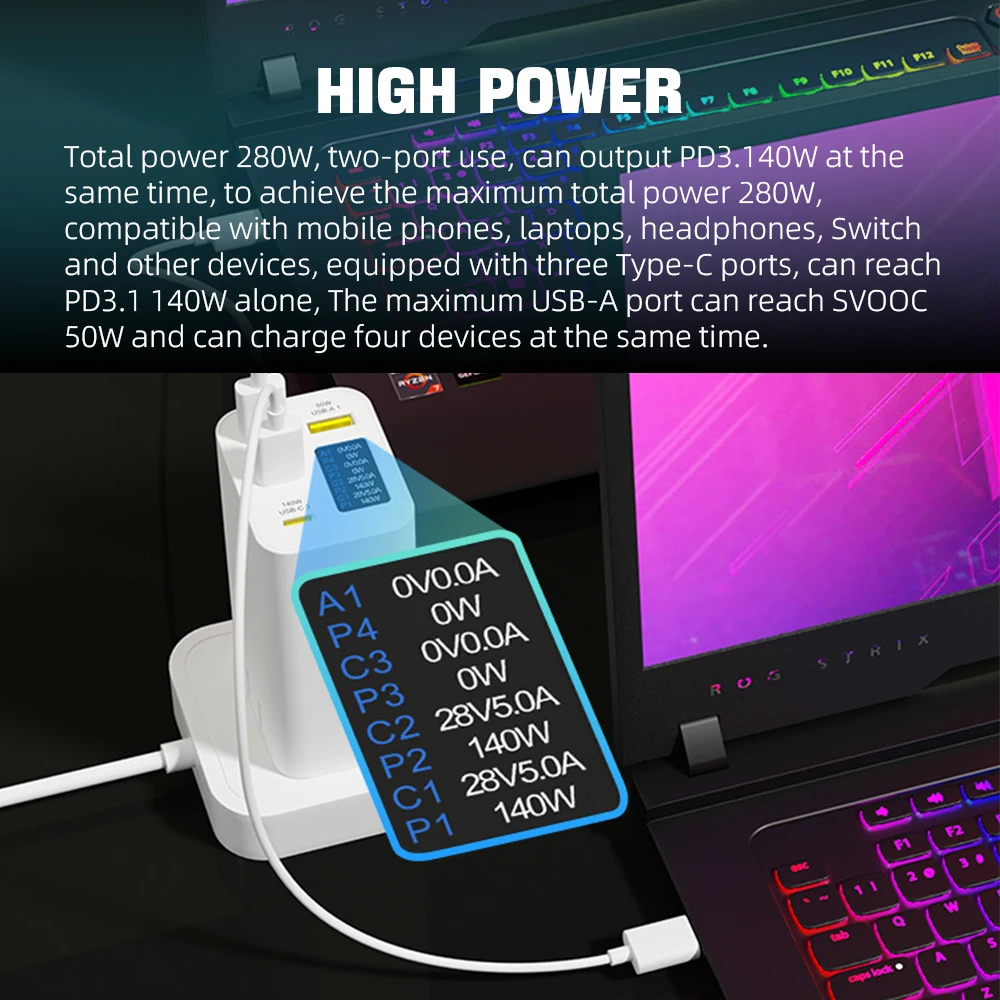 총 전력은 280 W입니다. 두 개의 포트를 동시에 사용하면 PD3.1 140 W를 출력하여 최대 총 출력 280 W에 도달 할 수 있습니다. 그것은 휴대폰, 노트북, 헤드폰, 그리고 스위치와 같은 다양한 기기들과 호환된다. 3 개의 TypeC 포트와 1 개의 USBA 포트가 장착되어 있습니다. 각 포트는 단독으로 사용할 때 최대 PD3.1 140 W를 출력할 수 있습니다. USBA 포트는 SVOOOC 50W 까지 도달할 수 있습니다. 동시에 최대 4 개의 장치를 충전 할 수 있습니다. 그러나 C3 와 A1 은 동일한 회로에 있으며 동시에 사용할 경우 전력은 각각 12W 에 불과합니다. 280 W의 최대 출력은 두 개의 포트를 동시에 사용하는 경우에만 얻을 수 있습니다. 3 개의 포트를 동시에 사용하는 경우 최대 전력은 270 W이며 4 개의 포트를 동시에 사용하는 경우 최대 전력은 229 W입니다. 다음은 출력 특성입니다.