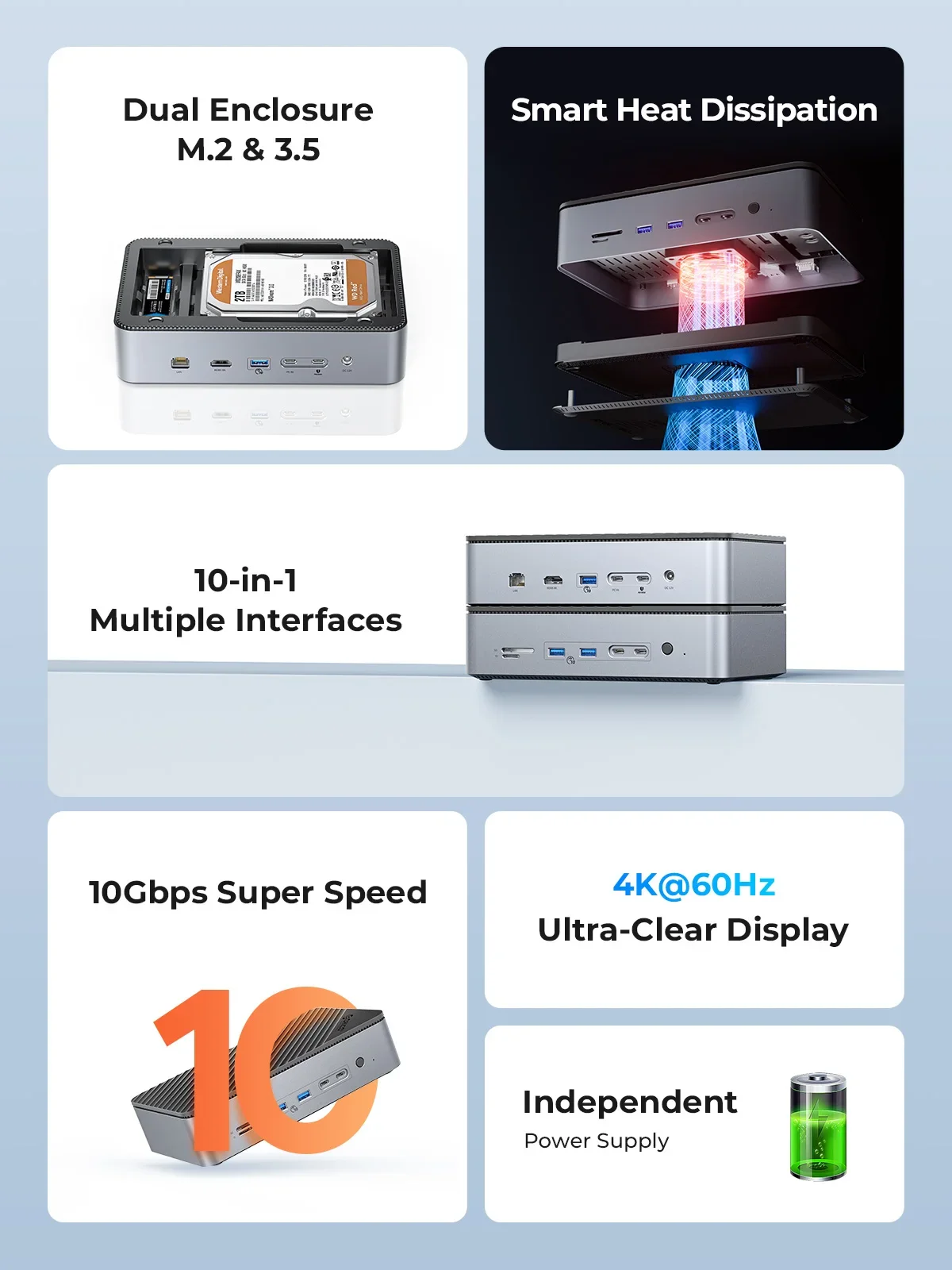 듀얼 M.2 및 3.5 인클로저가 포함된 10 in 1 USB C 허브.