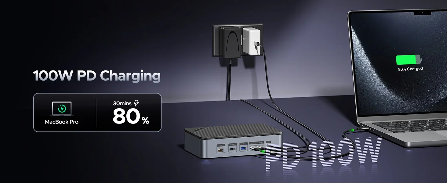 노트북과 같은 장치를 충전하려면 PD100W 포트를 케이블로 연결한 다음 해당 케이블을 벽면 콘센트나 멀티탭에 연결해야 하는 충전기에 연결해야 합니다.마지막으로 도크의 PC IN 포트를 사용하여 케이블을 노트북에 연결합니다.