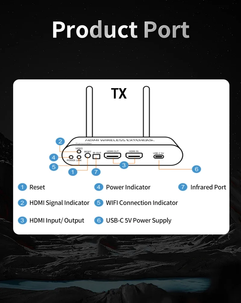 제품 소개: 아주 고품질, 자신감을 가지고 구매하십시오! 이 무선 확장기는 내장된 무선 전송 프로토콜을 통해 HDMI 오디오 비디오 신호를 전송합니다. 무선으로 대형 화면을 쉽게 즐길 수 있고, 더 효율적이며, 충격적이며, 편안하고 눈에도 좋습니다.