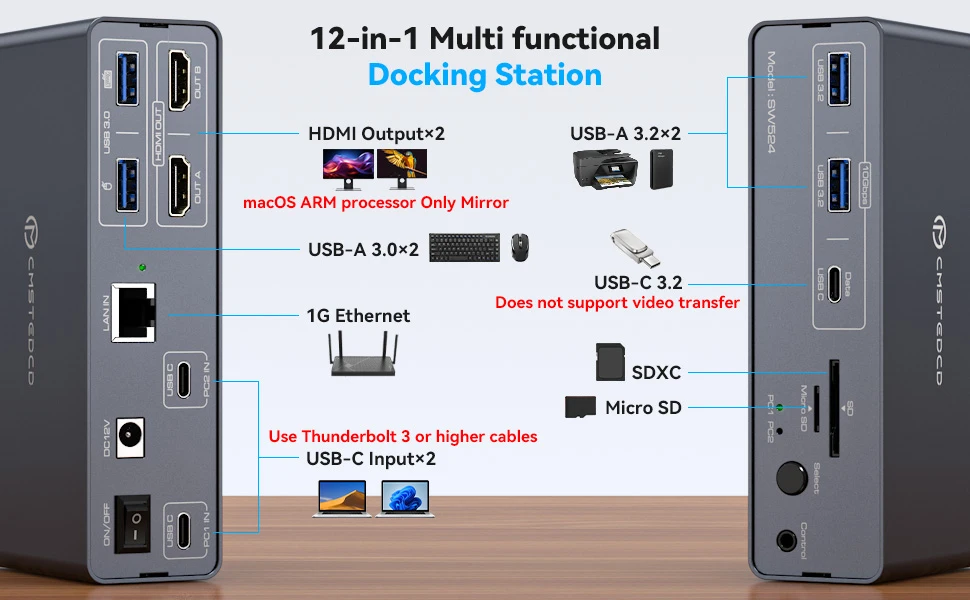 USBC Docking Station for 2 Laptops: Docking station allows two laptops, Macbooks or other USBC signal sources to share A 12in1 docking station with just one click. Allowing you to condense peripherals all down to one cable for each item, eliminating clutter and reducing the need for multiple ports. It easily accommodates your peripherals, like keyboard, mouse, printer SD cards and others. Simplifies desktop layout and creates A productive workspace. Note: The USB C port needs to support video transmission.USB C input without PD charging function