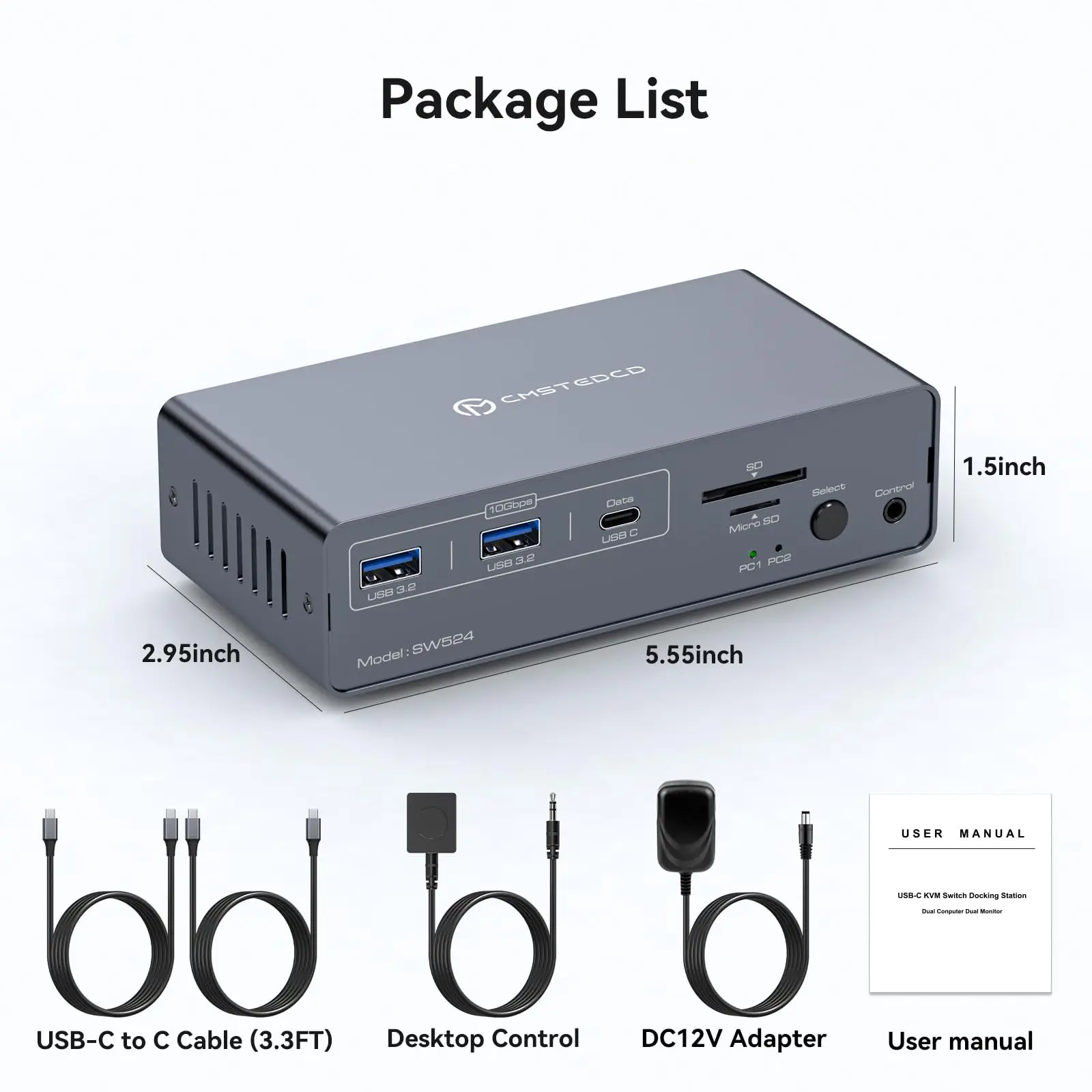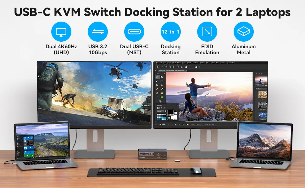 【KVM Switch 2 Monitors 2 Computers】Allows two laptops to share the following expansion ports: 2*5Gbps USB3.0, 1*1000Mbps Ethernet port, 2*4K60 HDMI Display, 2*10Gbps USB3.2, 1*10Gbps USB C , 1*SD, 1*microSD card. (Please note that two laptops cannot use the kvm docking Station at the same time.)