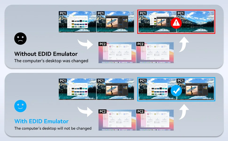 This docking station supports dual monitor resolution up to 4K@60HZ with EDID emulators in each input port, EDID emulation prevents resolution and icon rearrangement, your computers always get the correct display information. Free yourself from the hassle of constantly adjusting display settings.