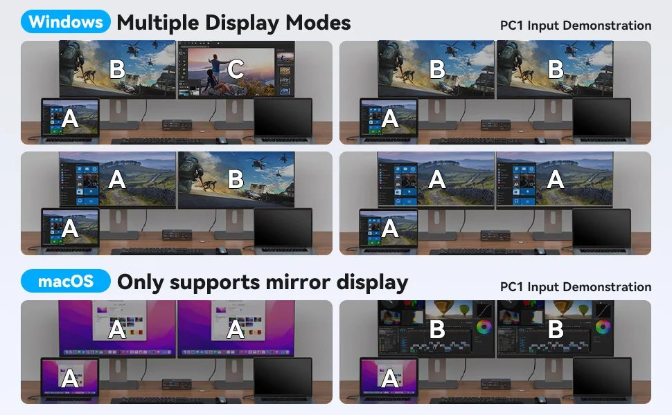【KVM Switch Dual Monitor】To transfer images from A laptop to two displays that support 4K resolution and 60Hz refresh rate, the laptop'S USBC ports must support the Thunderbolt 3/4 protocol or have DP Alt Mode.It is worth noting that in Windows environments, both Single Stream Transfer (SST) and MultiStream Transfer (MST) technologies are available, while in the MacOS environment, only Single Stream Transport (SST) technology is supported