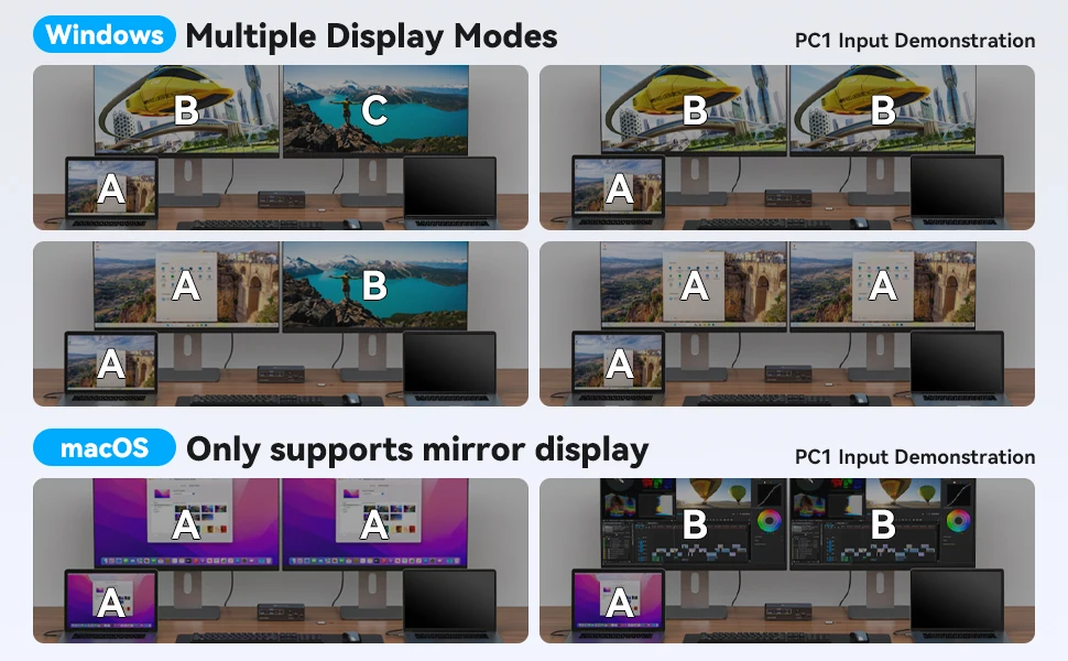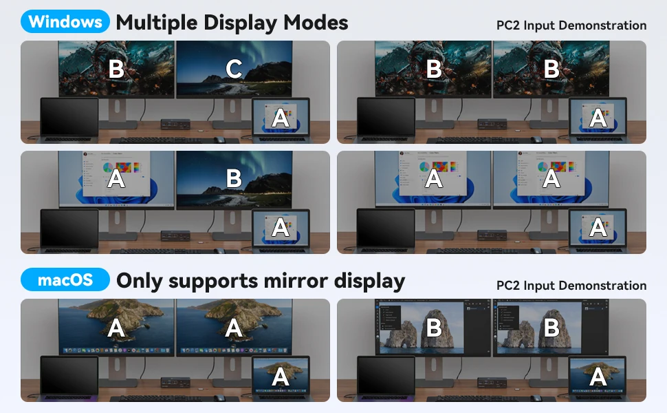macOS: Only supports mirror mode, I.E. AAA and ABB display modes, and the two monitors display the same picture.