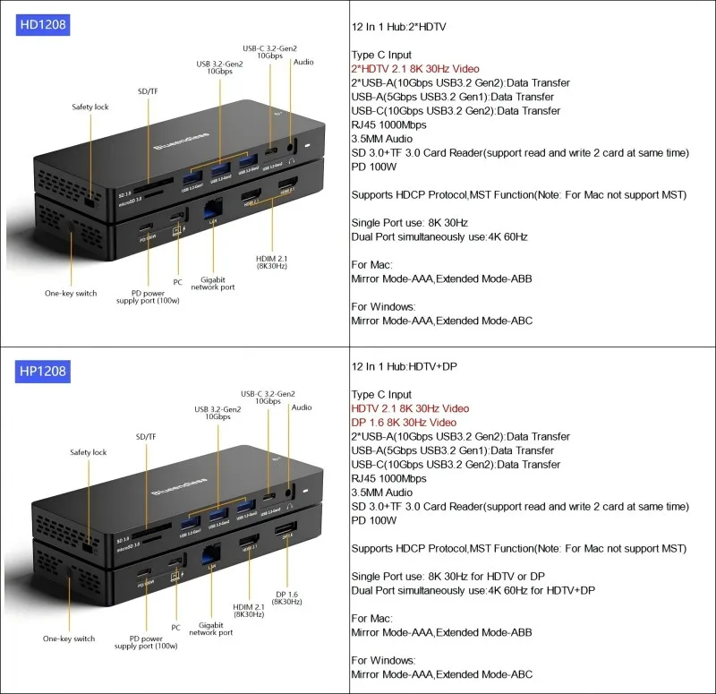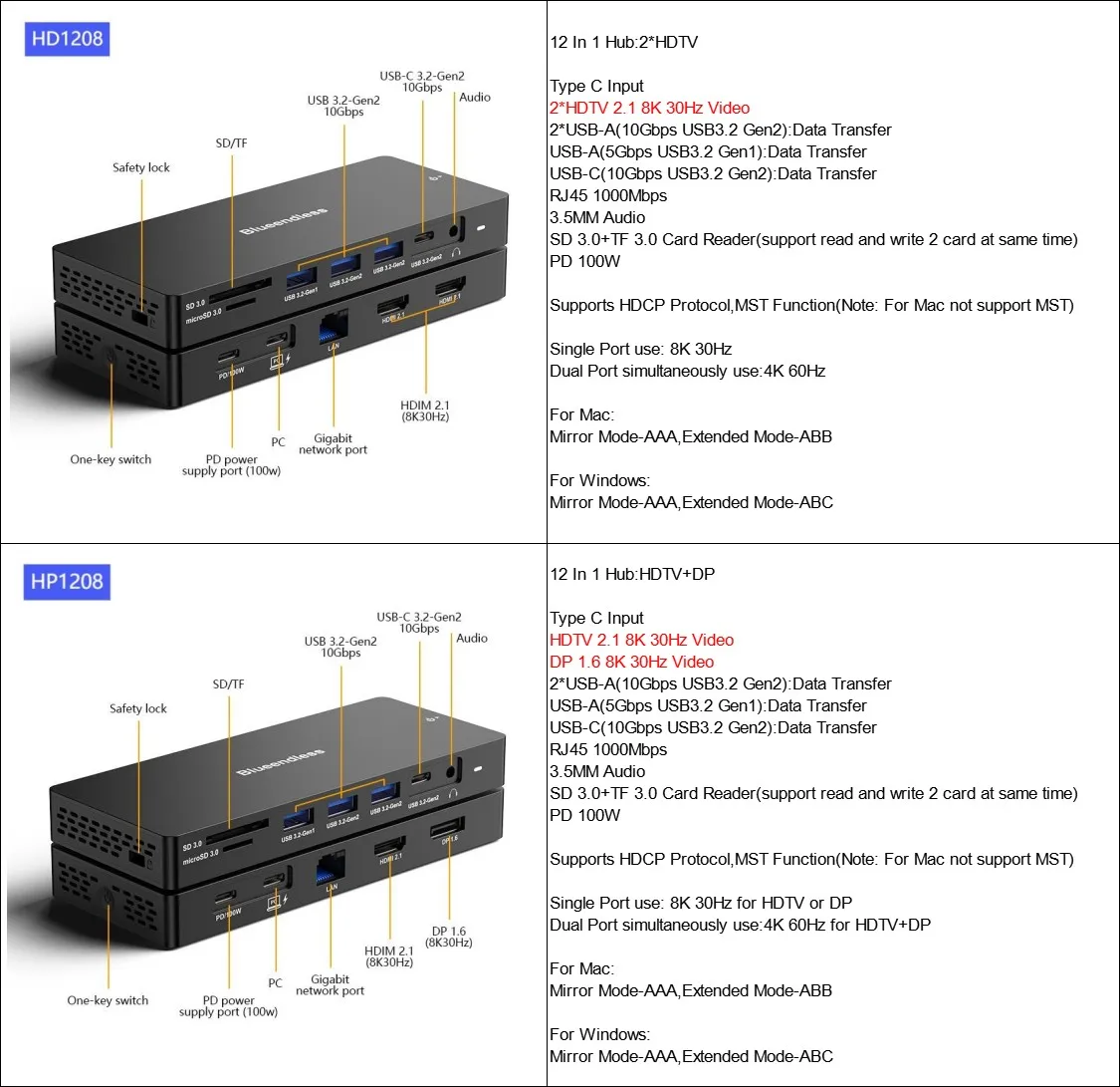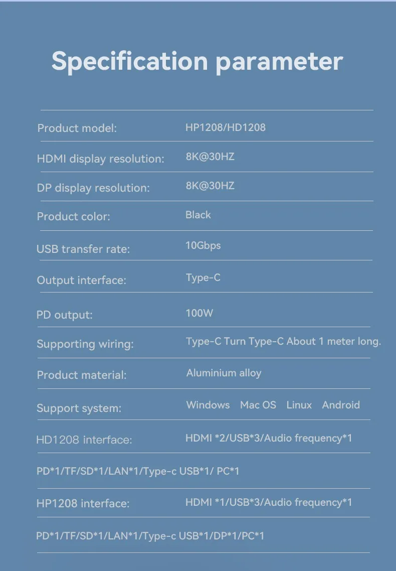 | HP1208 | HDTV+DP+2*USB-A 10Gbps+USB-A 5Gbps+USB-C 10Gbps+Lan+Audio+SD/TF+PD |