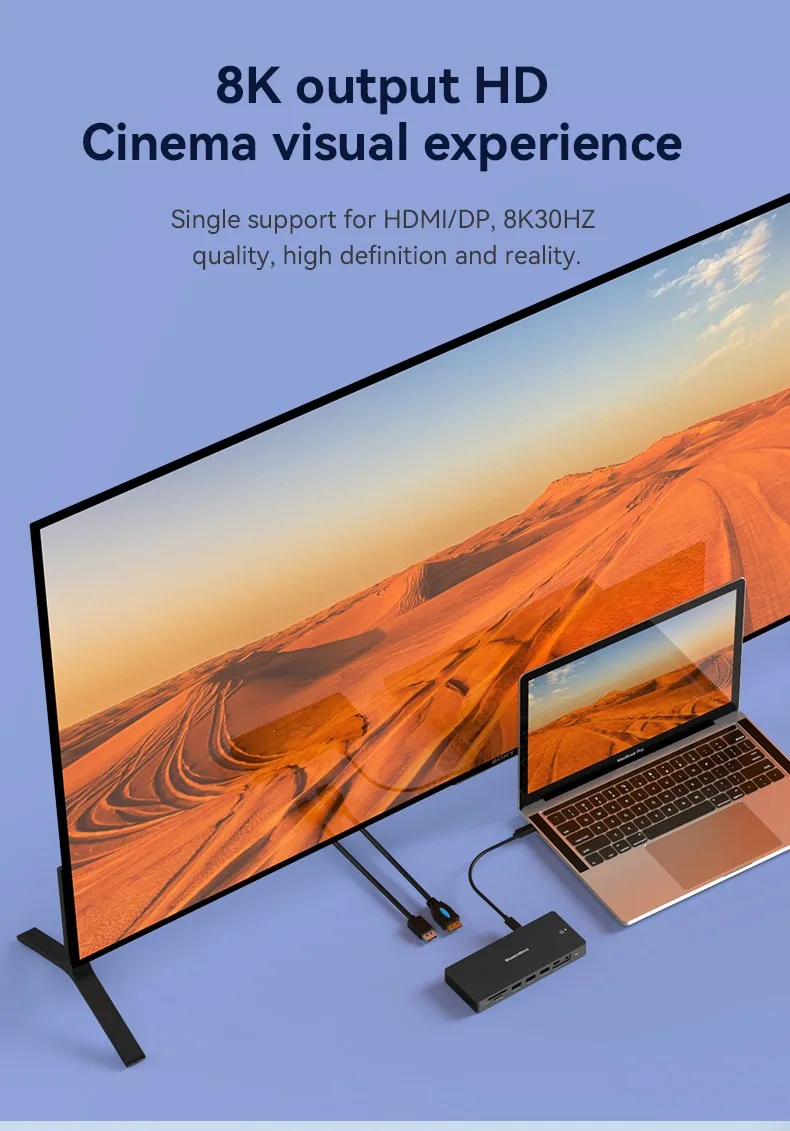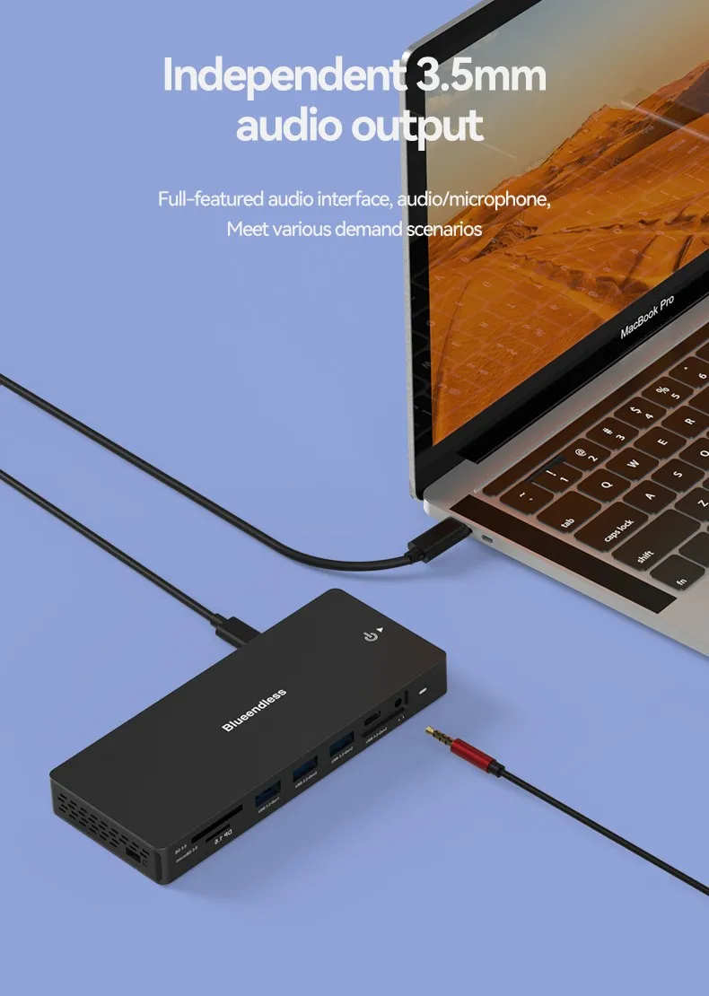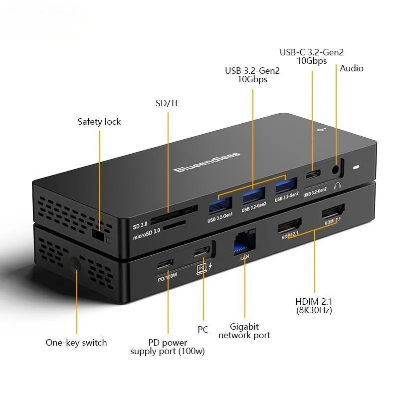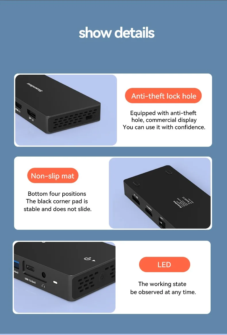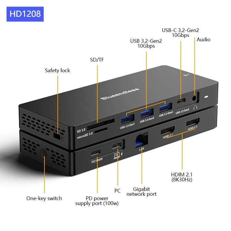 | HD1208 | 2*HDTV+2*USB-A 10Gbps+USB-A 5Gbps+USB-C 10Gbps+Lan+Audio+SD/TF+PD |