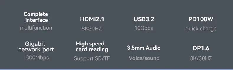 | output interface | HDMI 2.1, SD Card, Micro SD card, USB-C, PD100W, PD, USB 3.0, LAN port |