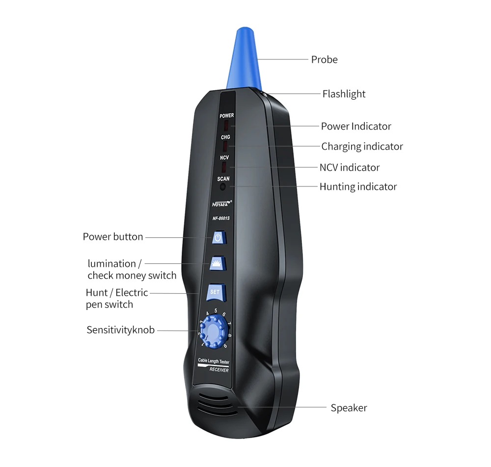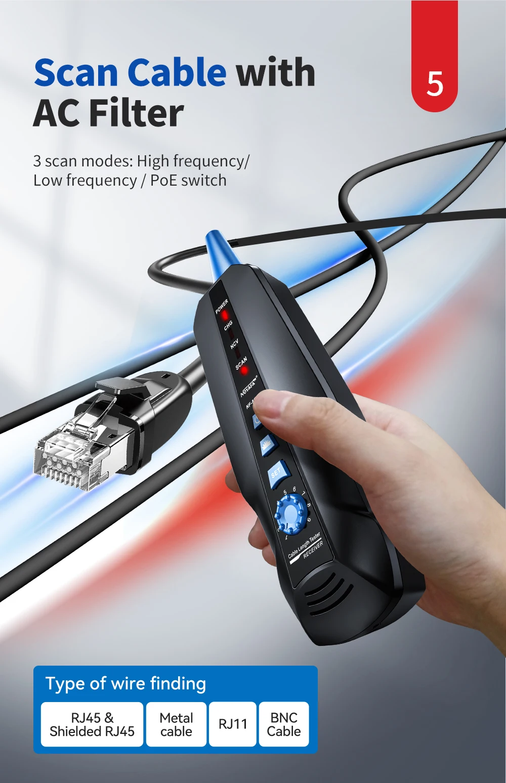 | Tracing Cable Type: | STP/UTP Cat5e, Cat6, Cat6a, Cat7 network cable, Telephone Cable, Coaxial Cable, and Common Metal Wires connected with alligator clip. |