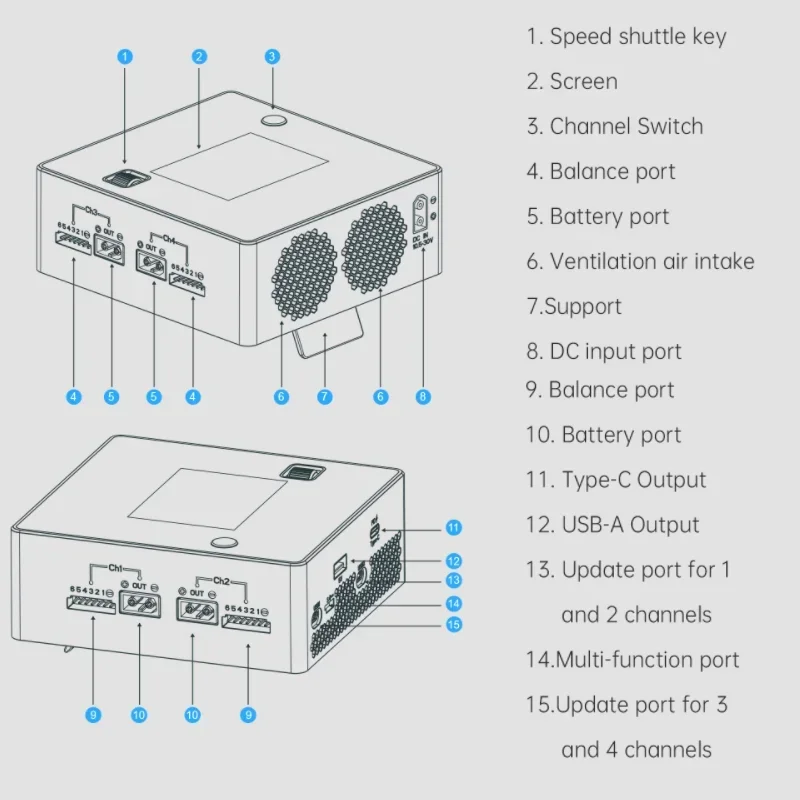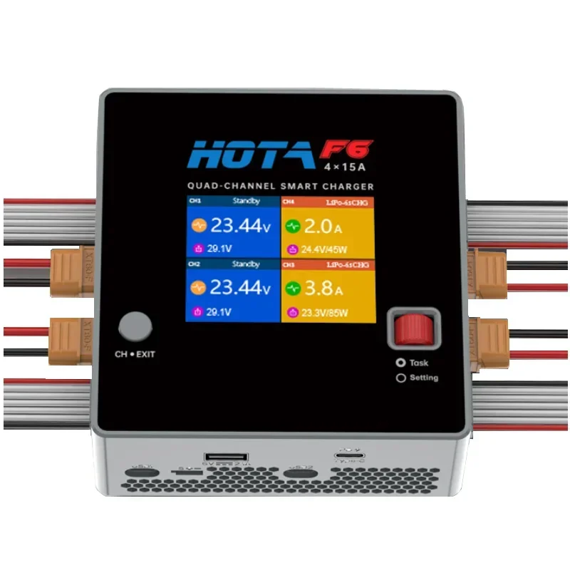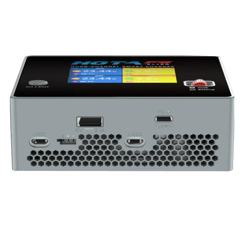 HOTA F6 4채널 250Wx4 4x15A 스마트 배터리 충전기는 1~6S LiHv/LiPo/LiFe/Lilon/Lixx 배터리용으로 특별히 설계되었습니다.4채널 출력으로 각 채널의 출력은 250W 15A입니다.HOTA F6 전면 패널에는 듀얼 USB 충전 포트와 TypeC 인터페이스가 장착되어 노트북, 태블릿 및 기타 장치 충전을 지원하는 뛰어난 전류 출력 성능을 제공합니다.