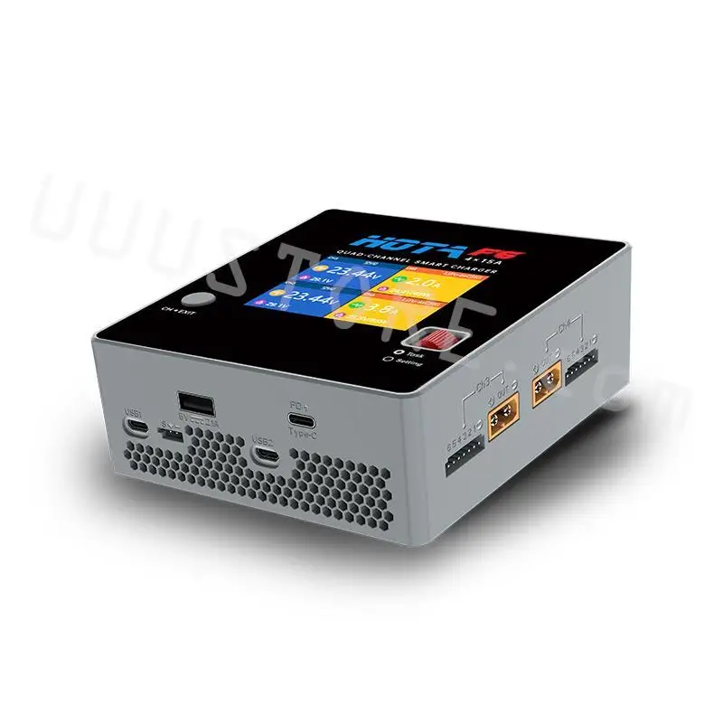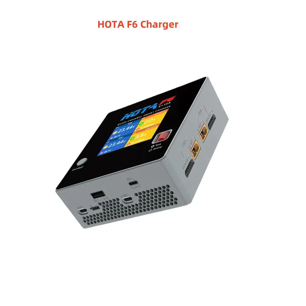 HOTA F6 4채널 250Wx4 4x15A 스마트 배터리 충전기는 1~6S LiHv/LiPo/LiFe/Lilon/Lixx 배터리용으로 특별히 설계되었습니다.4개의 채널 출력으로 각 채널의 전력은 250W 15A입니다.HOTA F6 전면 패널에는 듀얼 USB 충전 포트와 TypeC 인터페이스가 장착되어 노트북, 태블릿 및 기타 장치의 충전을 지원하는 탁월한 전류 출력 기능을 제공합니다.