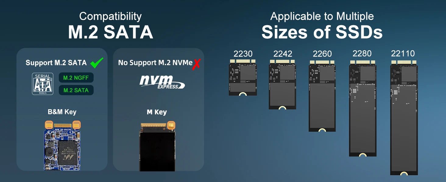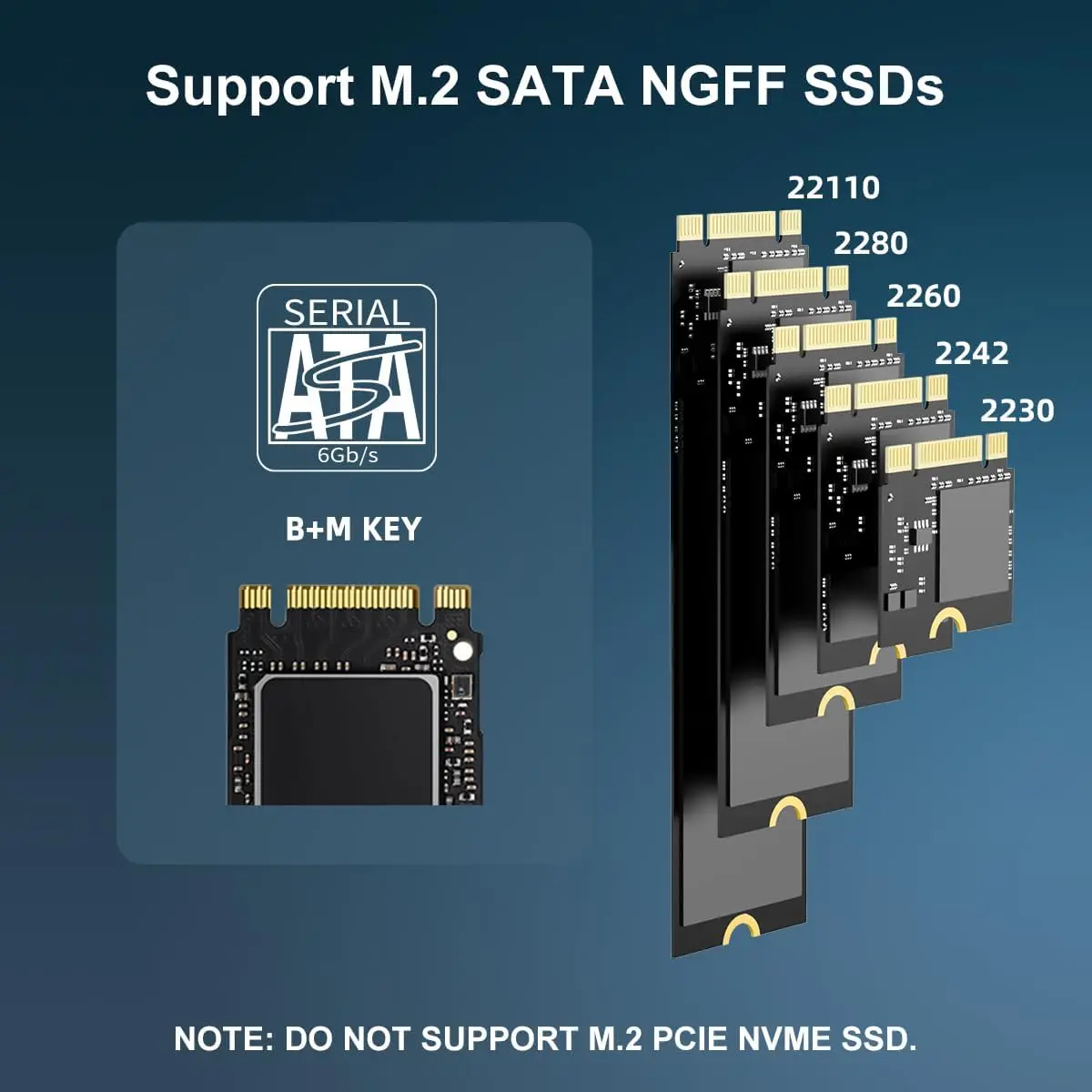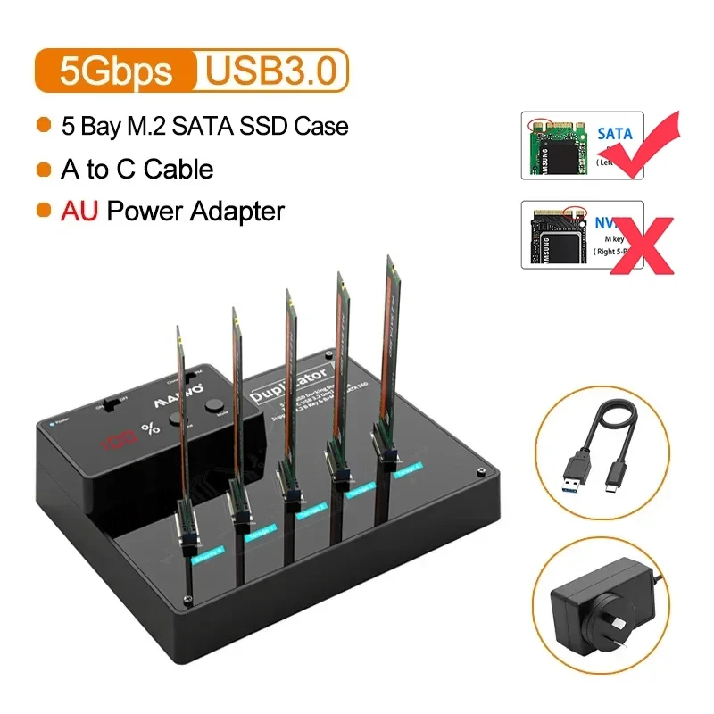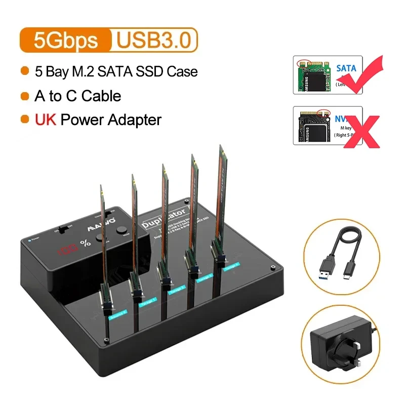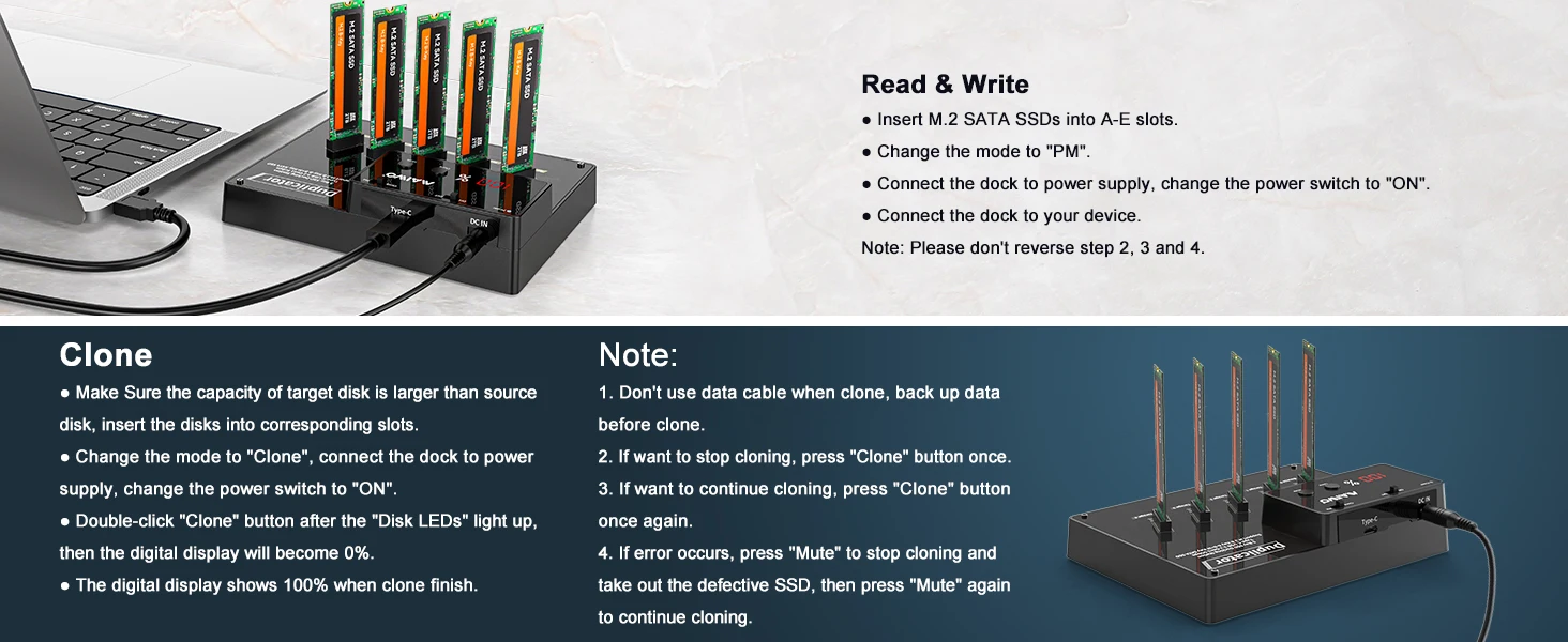 【호환성】이 5베이 M.2 도킹 스테이션은 2230/2242/2260/2280/22110mm 크기의 M.2 NGFF SATA SSD만 지원합니다.【M.2 PCIE NVME SSD는 지원하지 않습니다.】이 외장 하드 드라이브 복제기는 Windows, macOS, Linux 및 IOS와 호환됩니다.또한 노트북, 데스크탑, 태블릿, TV, 전화기, 라우터, PS4, PS5 등과도 작동합니다.