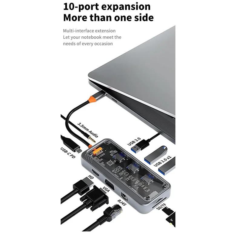 [10 포트 in 1] 노트북에서 더 많은 포트에 액세스하세요.10 in 1 도킹 스테이션은 4K, VGA, RJ45 이더넷, 100W PD, USBA 2.0 포트 2개, USBA 3.0 포트 1개, 3.5mm 헤드폰 포트 및 SD/TF 카드 리더기를 갖추고 있습니다.이 독특한 도킹 스테이션은 효율성과 단순성으로 실제 노트북 기능을 잠금 해제합니다.