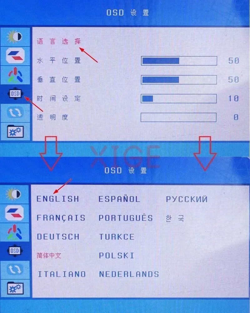 6, 화면 케이블 연결 및 언어 설정은 아래 사진을 참조하십시오.(OSD 메뉴에는 여러 인터페이스가 있습니다.다를 경우 문의해주세요)