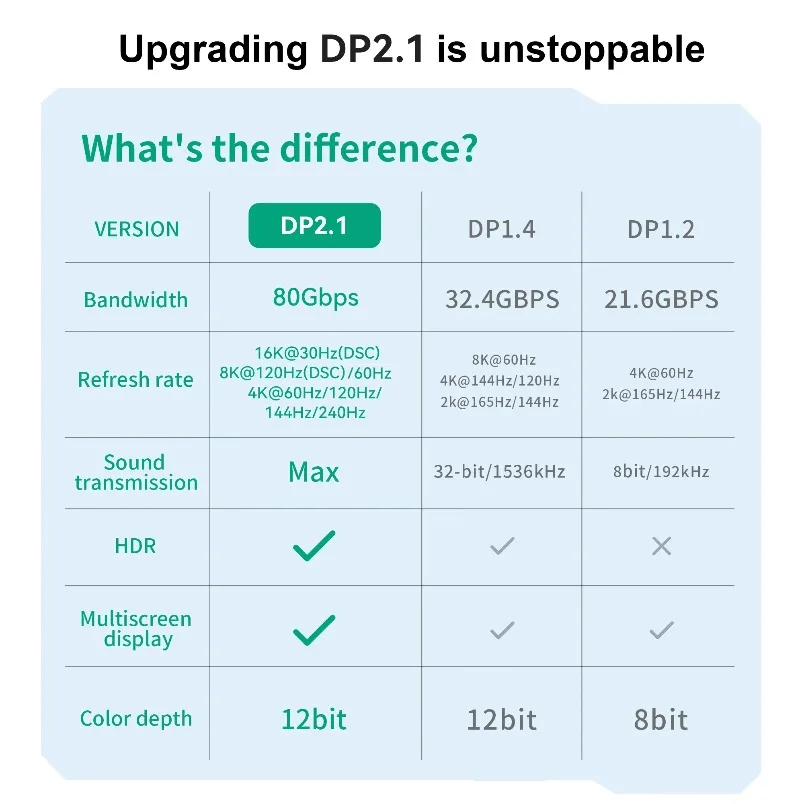 해상도: 최대 16K@60Hz(DSC)8k@120Hz(DSC)/60Hz, 4k@240Hz, 4k@144Hz, 4k@120Hz, 4k@60Hz, 1440P@240Hz, 1440P@165Hz, 1440P@144Hz, 1440P@120Hz, 1080P@240Hz, 1080P@144Hz, 1080P@120Hz