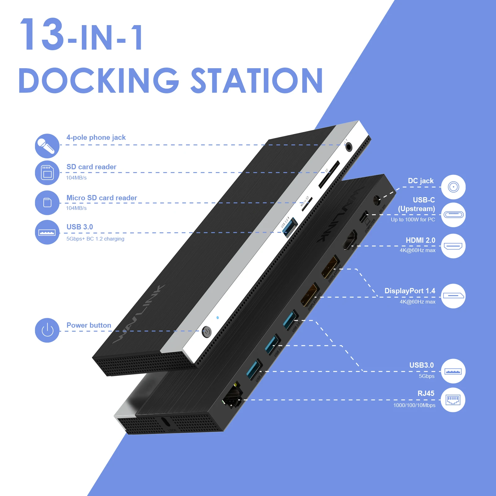 Wavlink USB C 13in1 도킹 스테이션, 100W PD 충전, HDMI가 있는 트리플 4K 디스플레이 TypeC 어댑터, 디스플레이 포트 2 개, POWER LOGIC 포트, 이더넷 포트, 마이크로 SD 및 SD 카드 리더, 3.5mm 오디오 잭 및 4 USB 3.0 및 1 USBC 포트, Windows / Mac 등용
