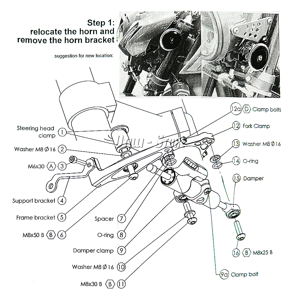 설치 후 헤드를 맨 오른쪽과 맨 왼쪽으로 돌려 스티어링 댐퍼의 활동을 위한 충분한 공간이 있는지 확인하십시오.