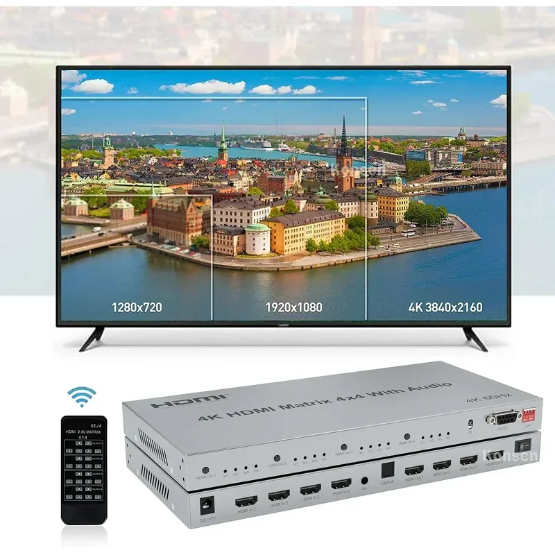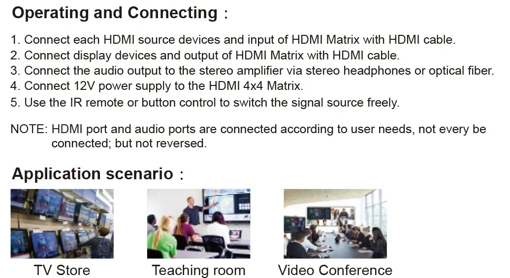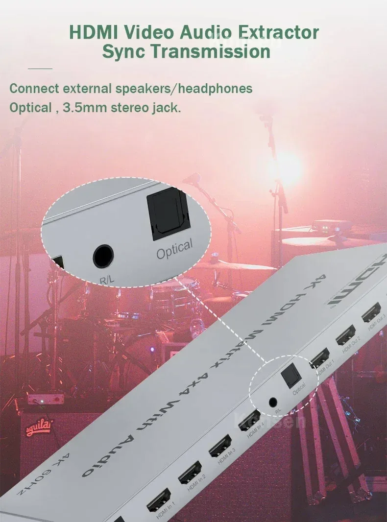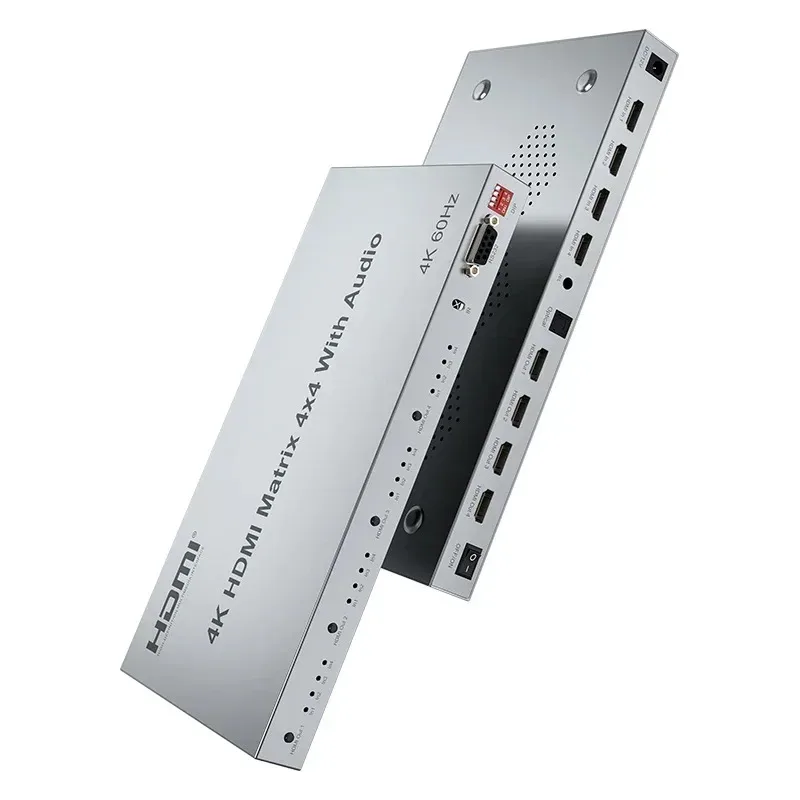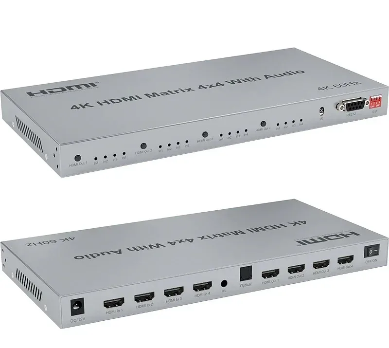 HDMI 매트릭스 4x4는 HDMI 출력 1개 포트를 통해 광섬유 및 스테레오 헤드폰 출력을 통해 4개의 HD 신호 소스를 4개의 HD 디스플레이 터미널에 동시에 연결할 수 있습니다.