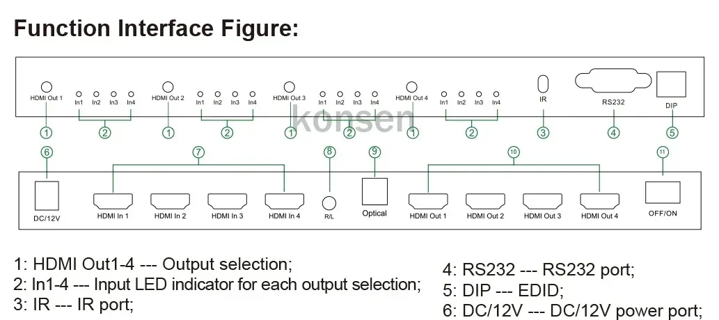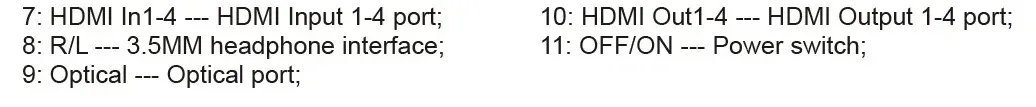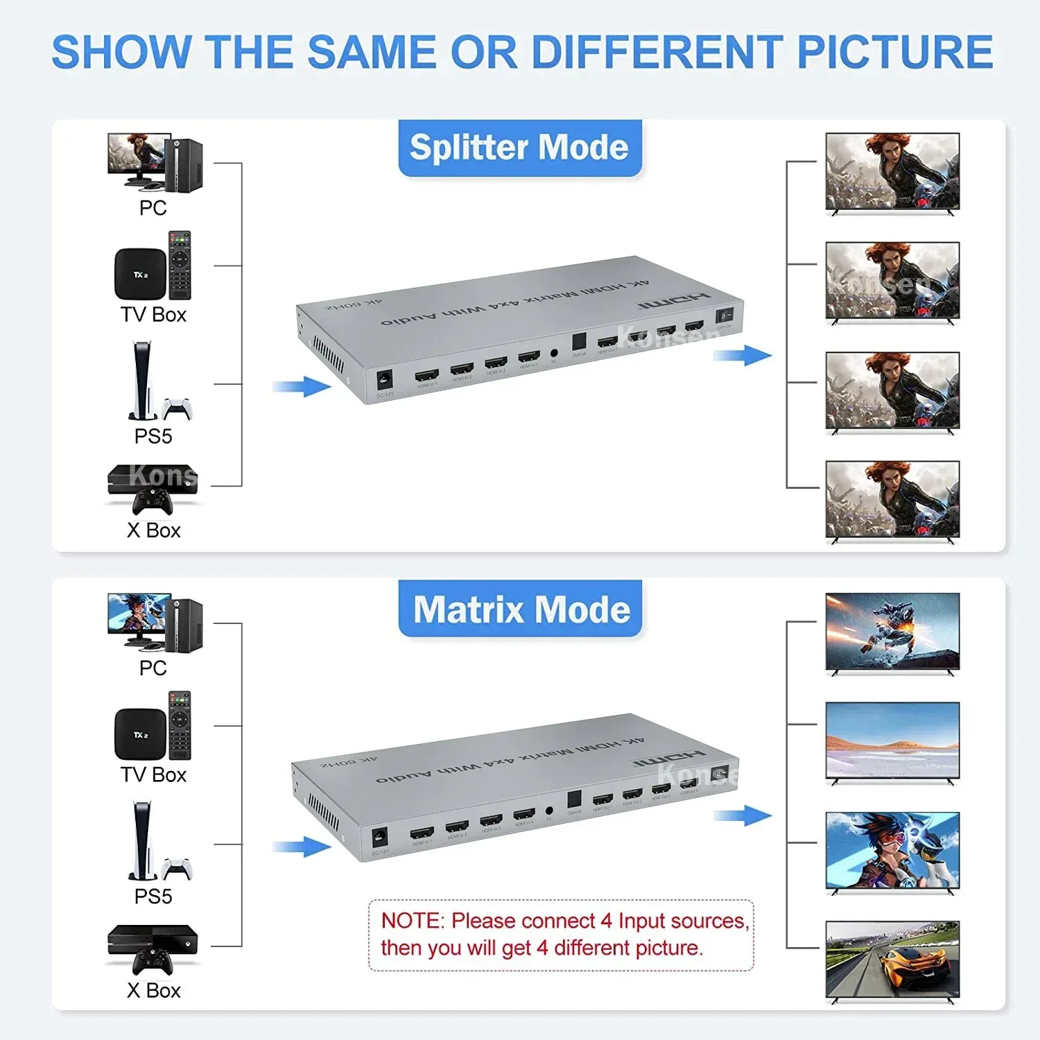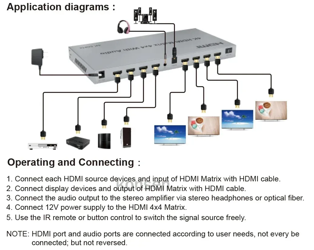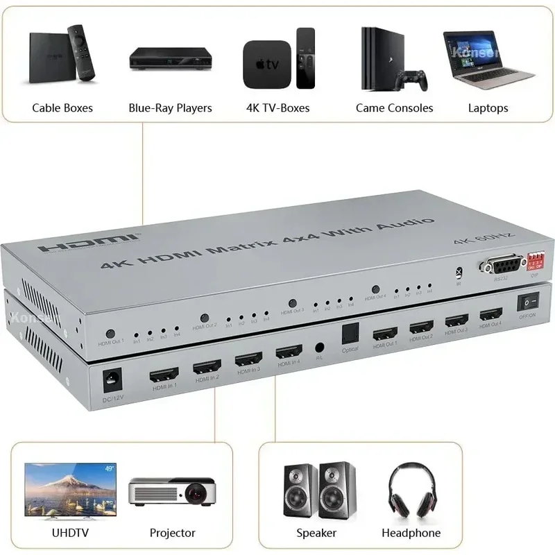 HDMI 매트릭스 4x4는 HDMI 출력 1개 포트를 통해 광섬유 및 스테레오 헤드폰 출력을 통해 4개의 HD 신호 소스를 4개의 HD 디스플레이 터미널에 동시에 연결할 수 있습니다.