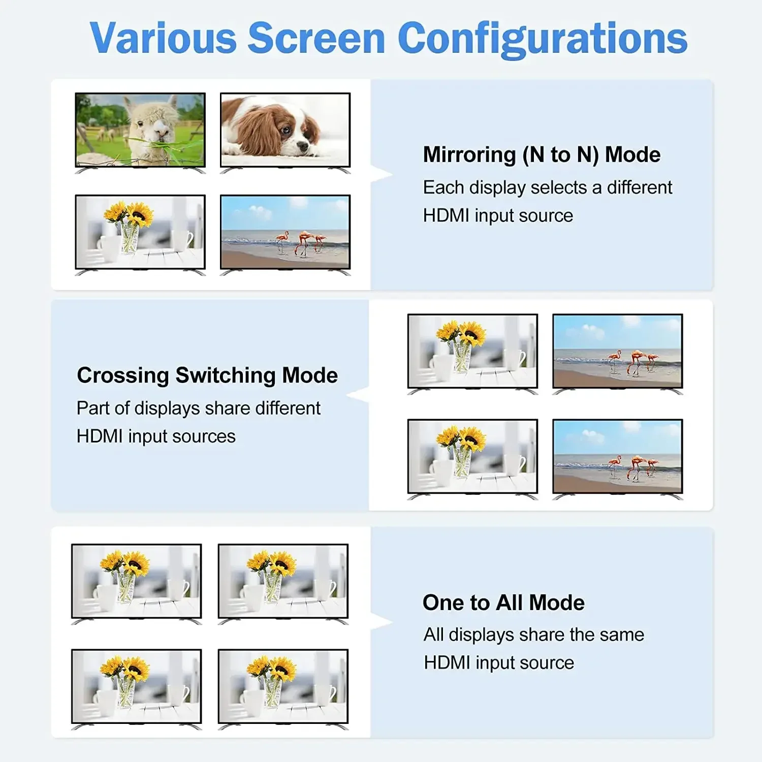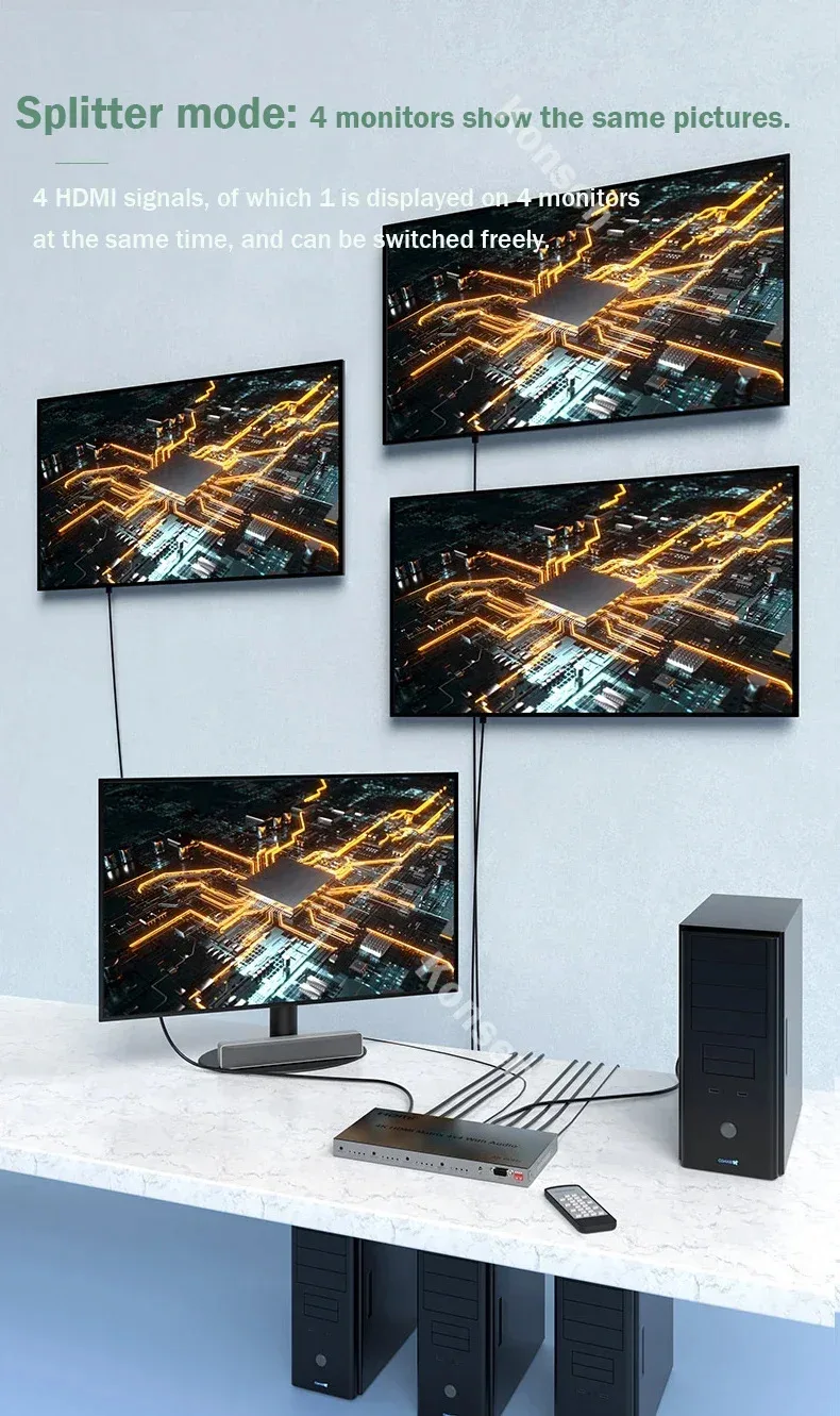 이 HDMI 매트릭스는 무손실 전송을 지원하며 공간 및 보안 문제, 데이터 센터 제어, 정보 배포, 회의실에서 널리 사용됩니다.