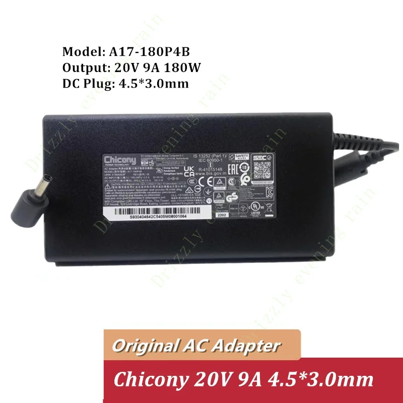 원래 chicy a17180p4b a180a063p 20V 9A 180W POWER LOGIC 공급 장치 노트북 충전기 AC 어댑터 4.5x3.0mm DC 플러그