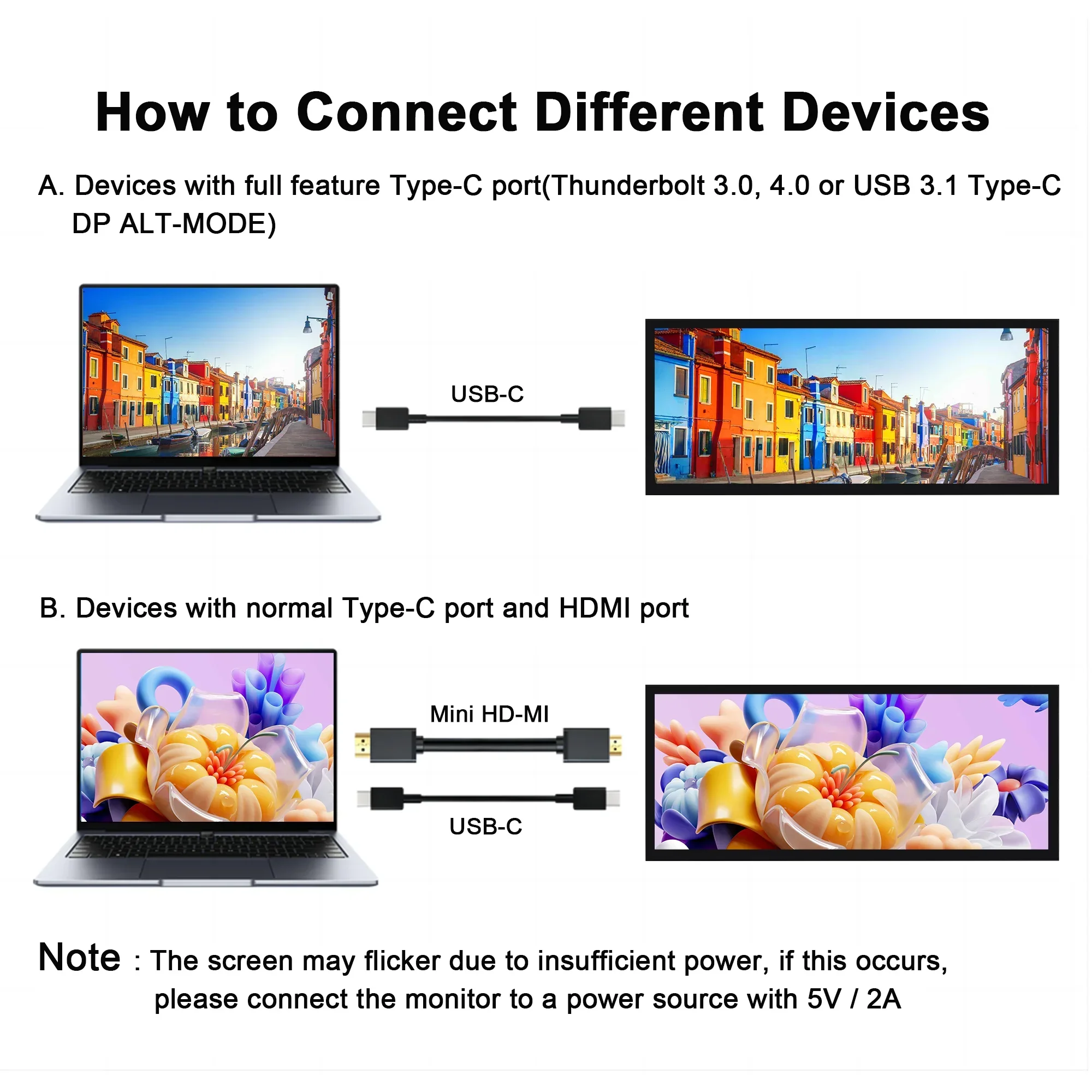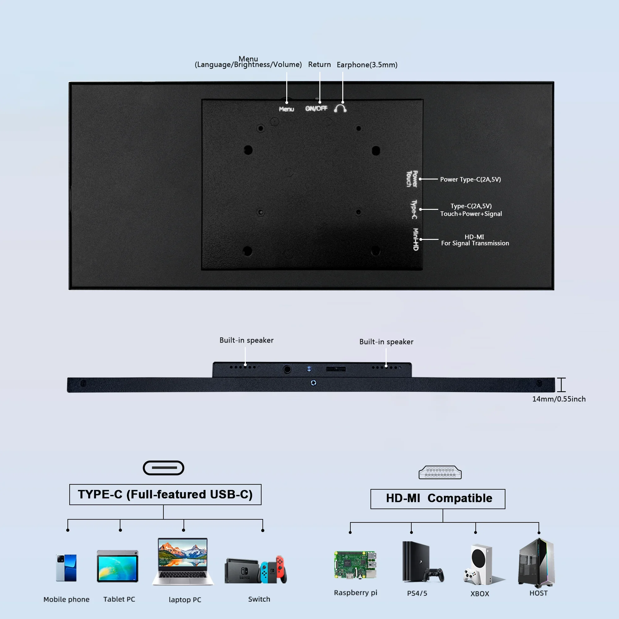 컴팩트하고 세련된 두 번째 모니터: 슬림한 프로필과 가벼운 구조를 특징으로 하는 이 12.3인치 터치 모니터는 휴대성과 공간 절약형 설정을 위해 설계되어 이동 중에도 사용하기에 적합합니다.깔끔한 작업 공간을 위해 인터페이스가 뒷면에 숨겨져 있습니다.