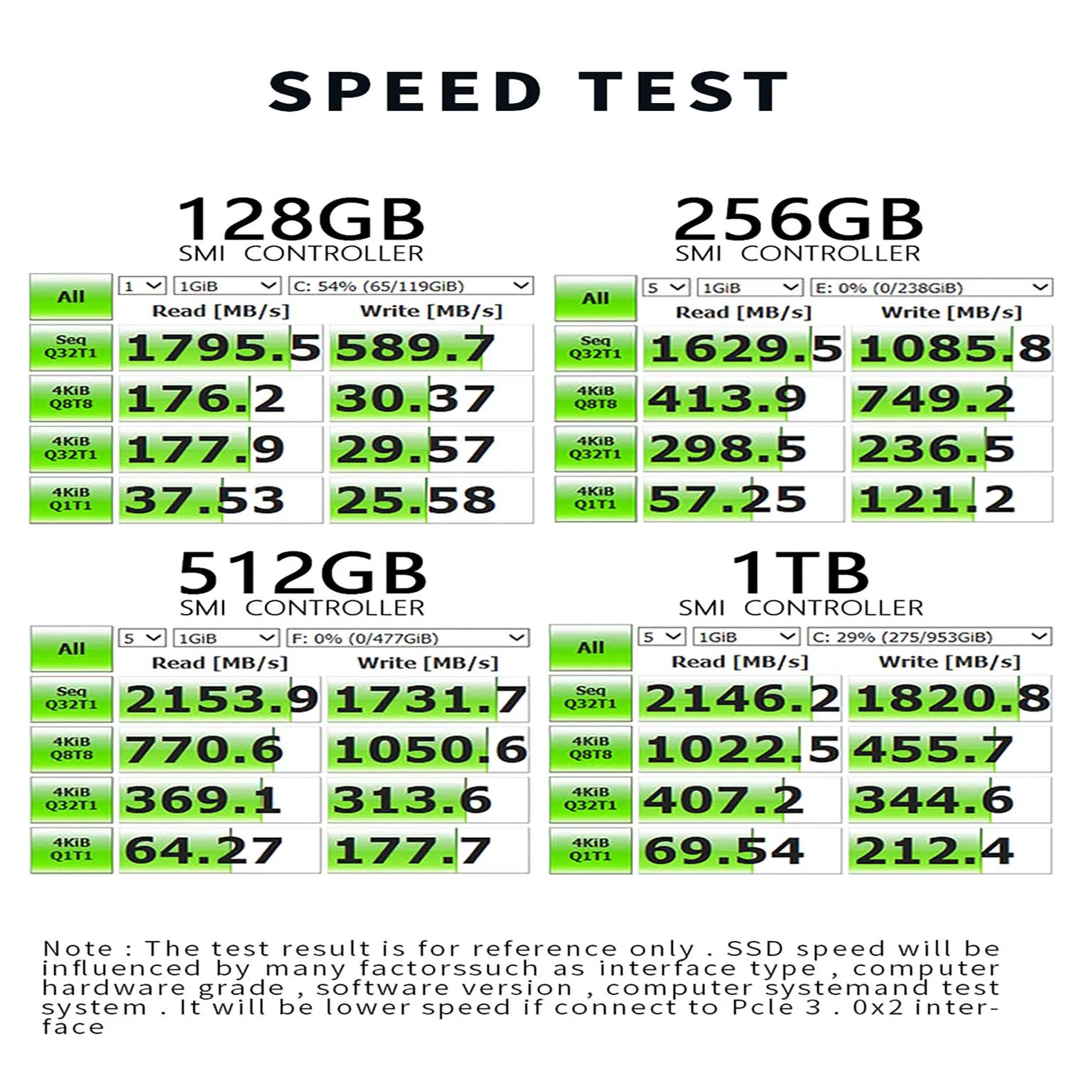 특정 구성 데스크톱, PCIE 3.0x16 인터페이스에 대한 속도 테스트, 운영 시스템없이. 참조 용 테스트 결과. 노트북은 바탕 화면보다 낮고 불안정합니다. PCB 색상, 플래시 칩 유형, 플래시 칩 번호는 각 배치에 따라 다를 수 있습니다.