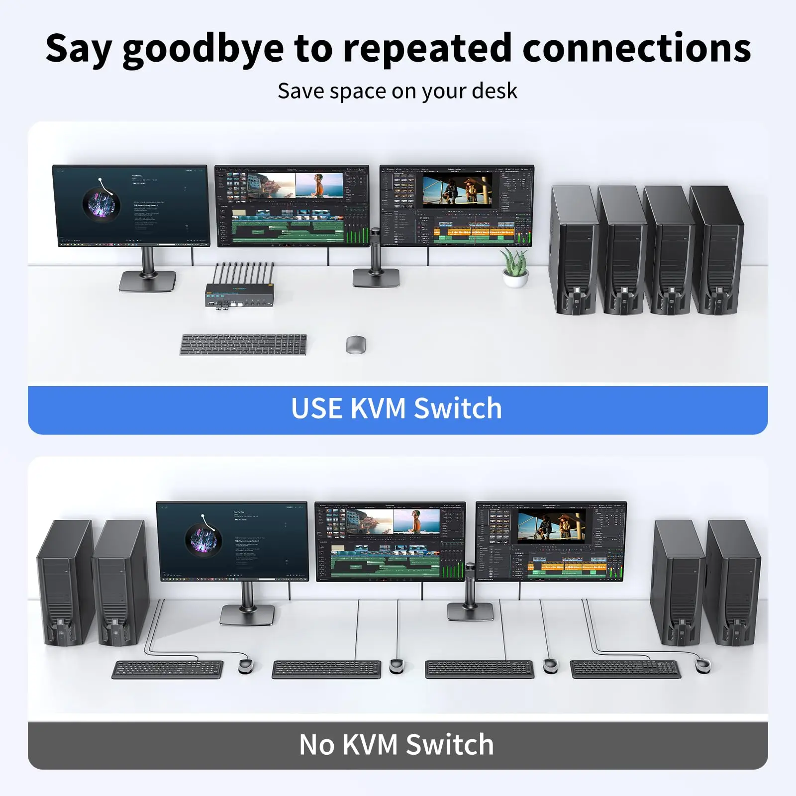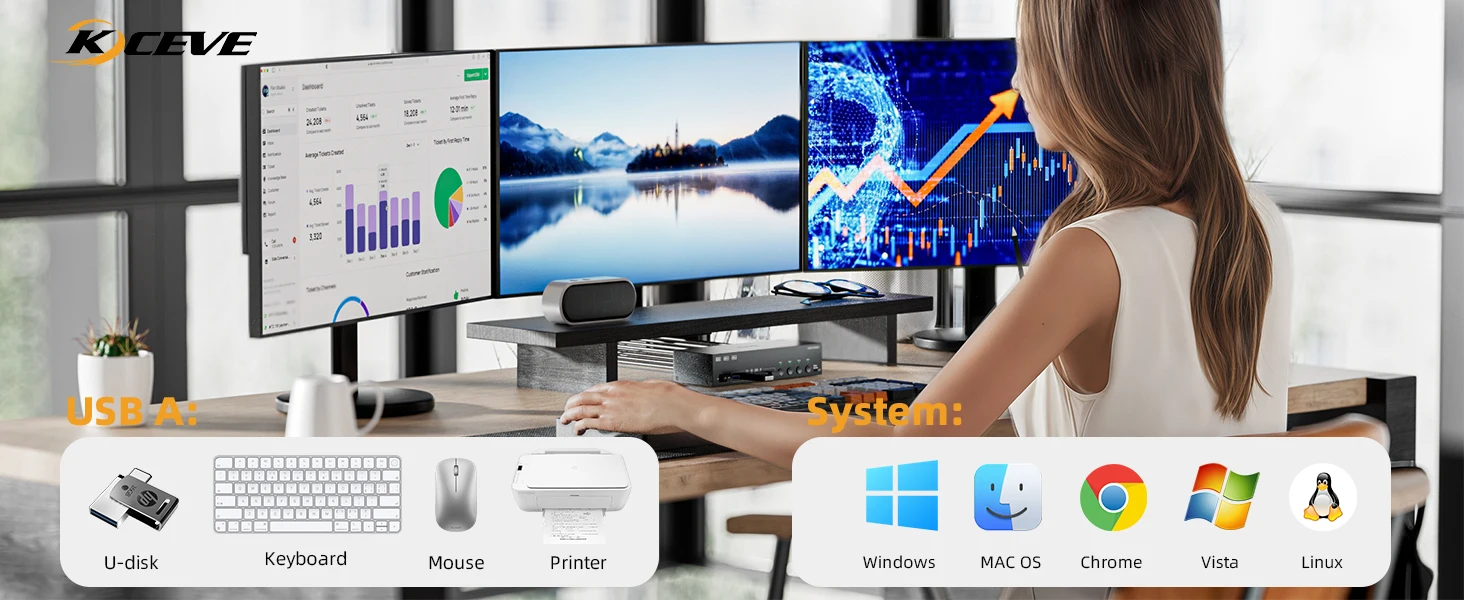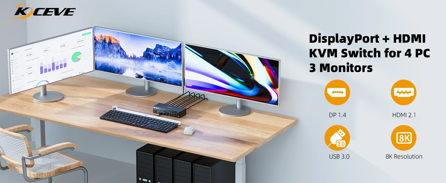 이 2개의 Displayport+HDMI 트리플 모니터 KVM 스위치는 3대의 컴퓨터 또는 노트북이 3개의 모니터와 4개의 USB 3.0 장치를 공유하는 데 적합합니다.