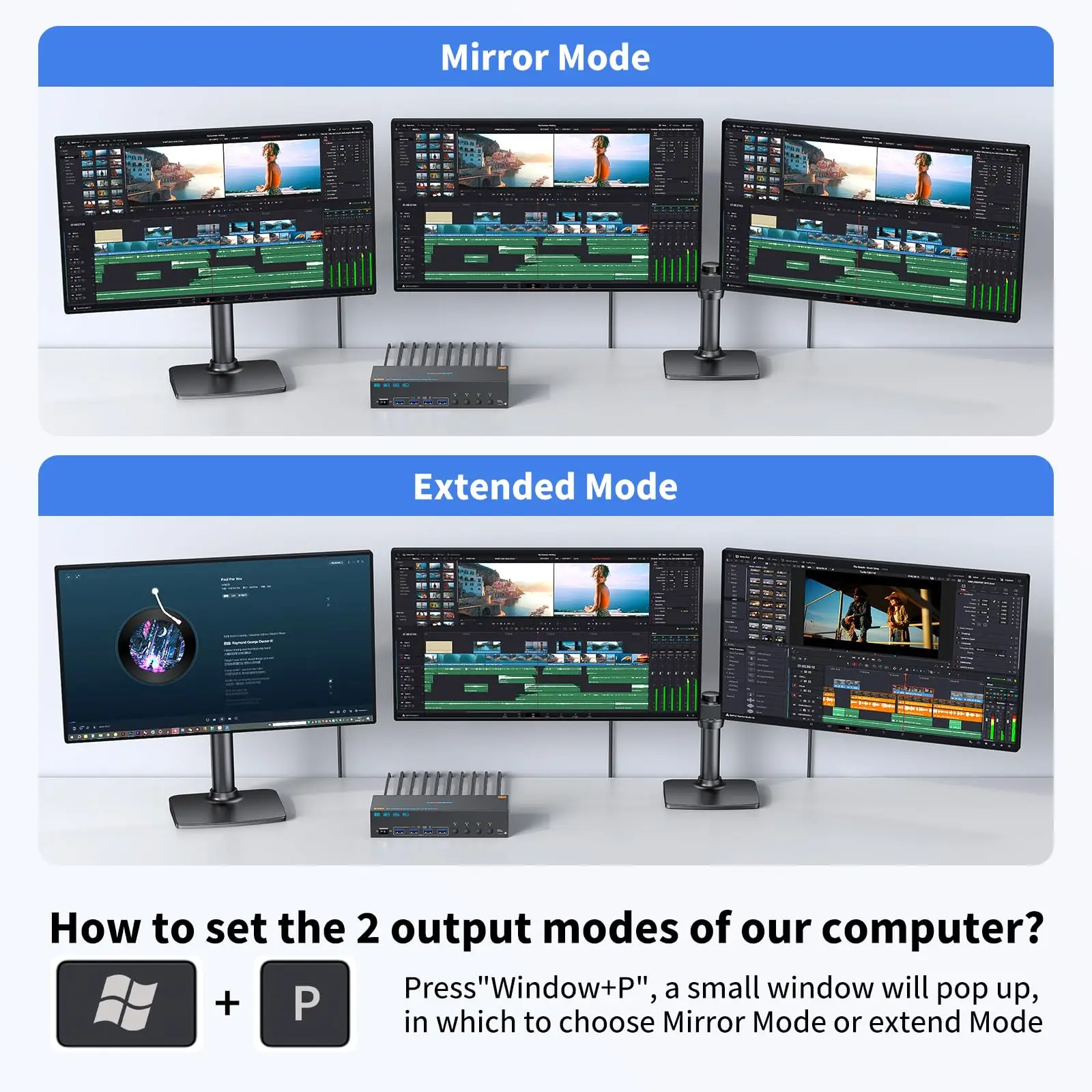 3개의 모니터를 작동하려면 각 컴퓨터에 HDMI 케이블 1개 + DP 케이블 2개 + USB 케이블 연결 1개가 필요합니다.좋은 HDMI 및 DP 케이블을 직접 구입하십시오. HDMI 케이블과 DP 케이블이 충분하지 않으면 화면이 깜박이거나 불안정해집니다.