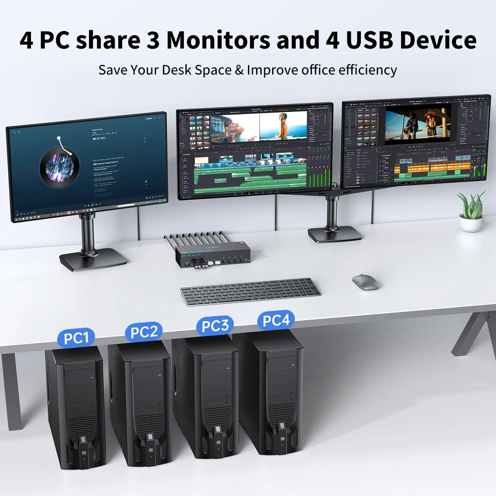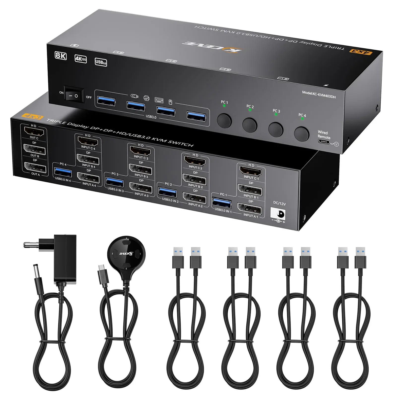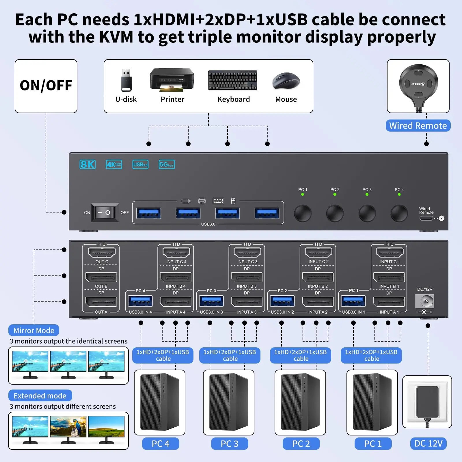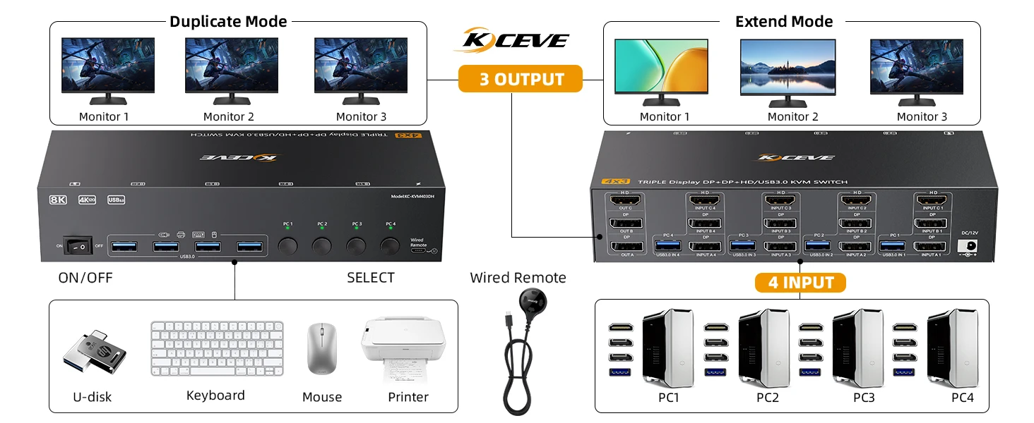 8K KVM 스위치 4 컴퓨터 3 모니터:트리플 모니터 KVM은 4개의 PC 또는 노트북, 3개의 모니터, 키보드, 마우스, 프린터, 스캐너 및 USB 스틱과 같은 4개의 USB 장치를 허용하는 GLOBE MOTORS 4in3out KVM 스위치입니다.4대의 컴퓨터를 사용하는 사용자를 위한 완벽한 도구로, 효과적으로 복잡함을 줄이고 생산성을 극대화합니다.참고: 컴퓨터의 카드에는 모니터 3개를 올바르게 연결하려면 DP 포트 2개와 HDMI 포트 1개가 있어야 합니다.