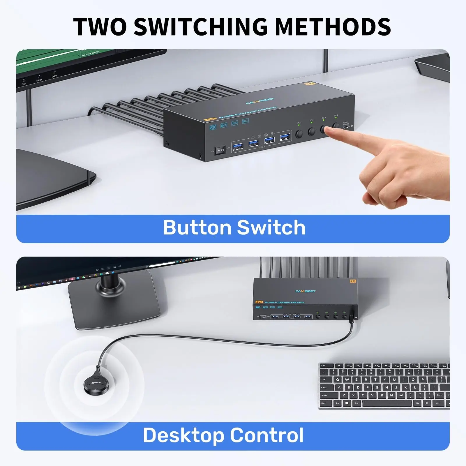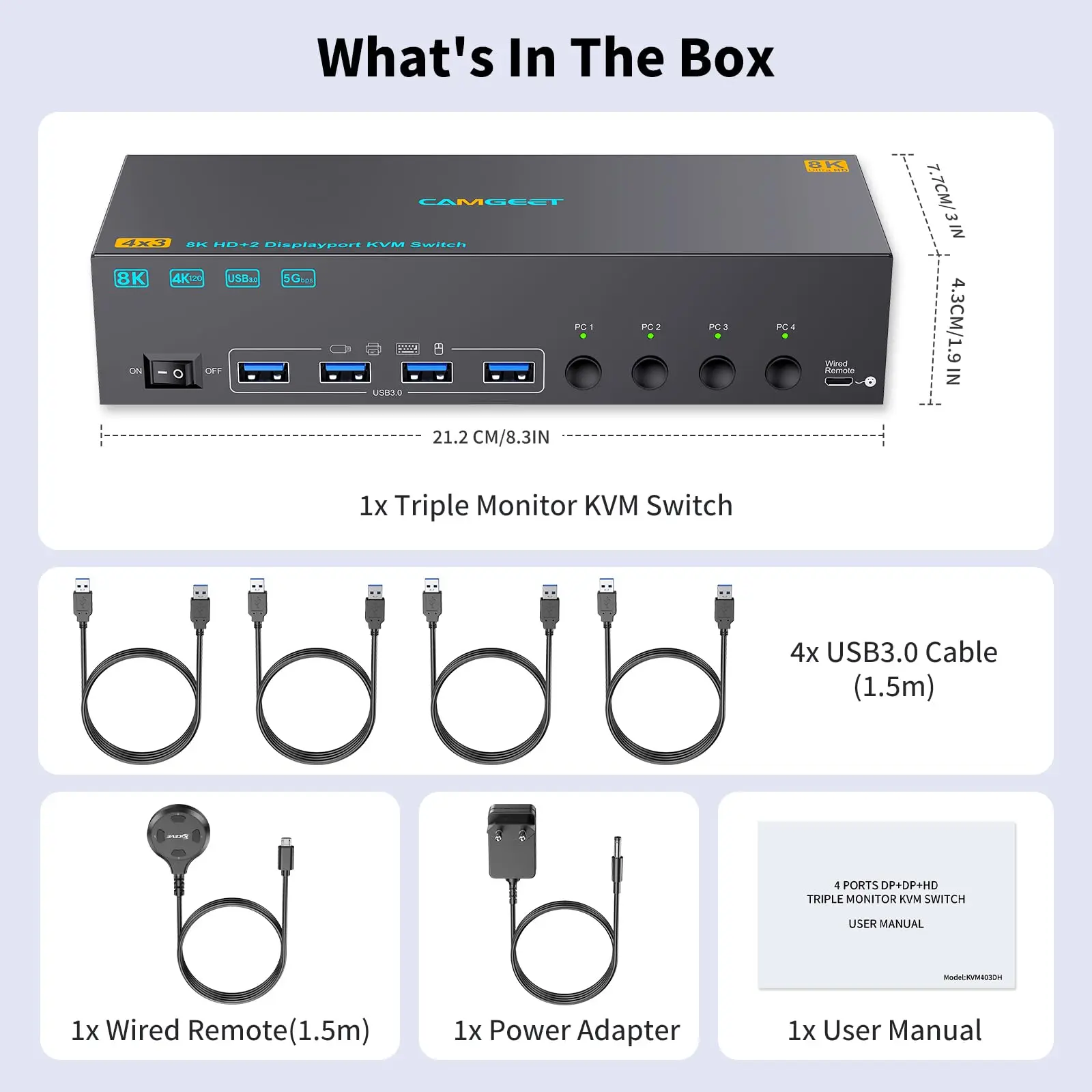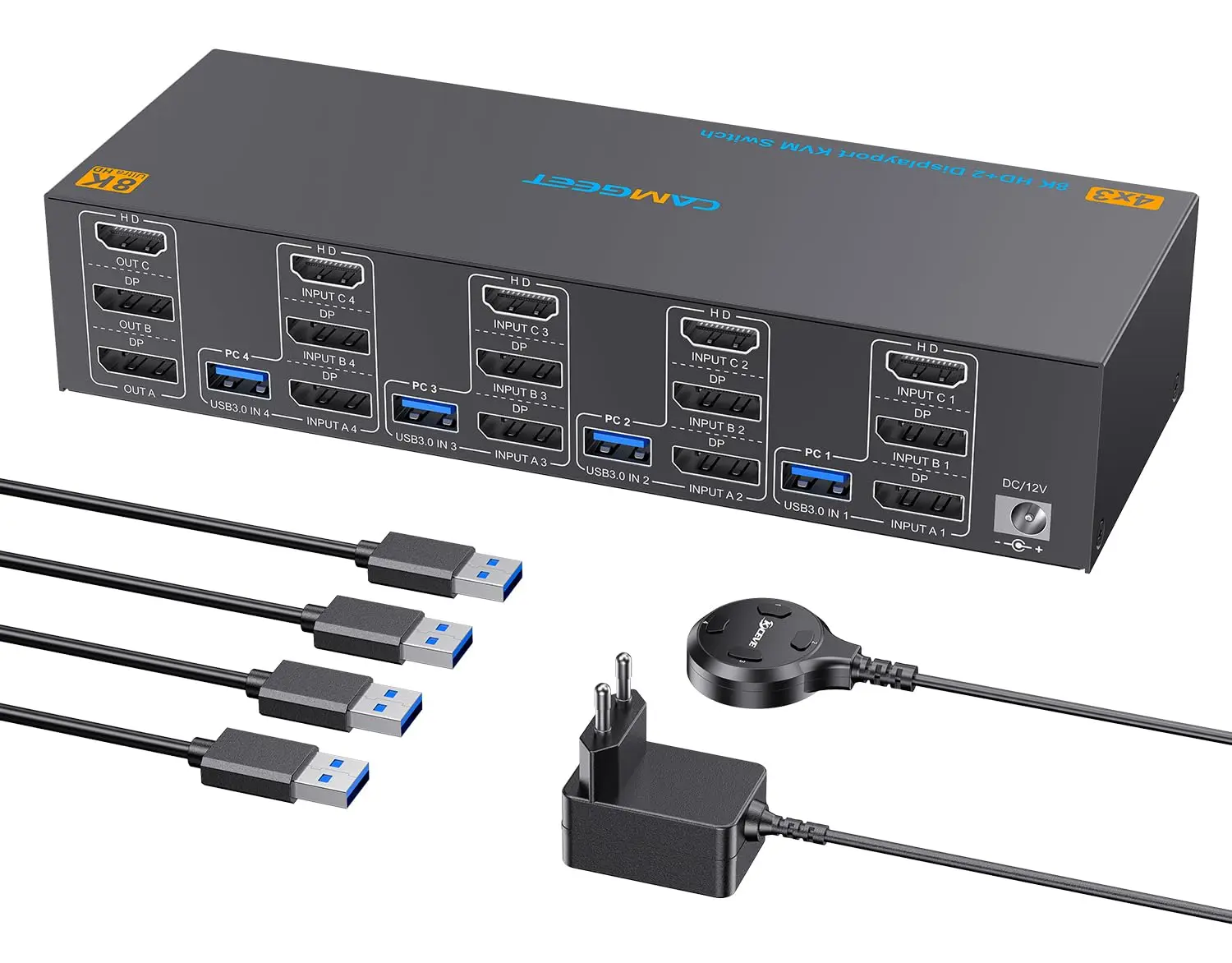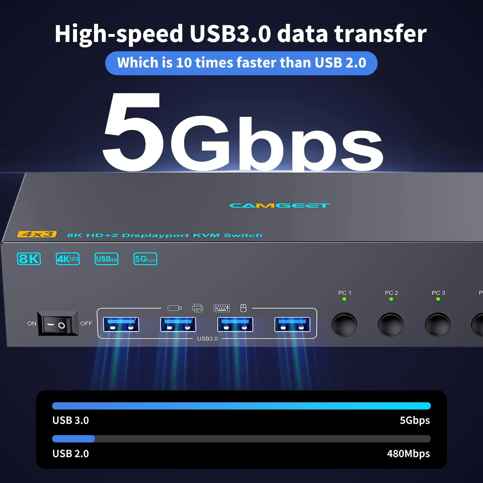 【5Gbps USB 3.0 KVM 스위치가 더욱 안정적입니다.】camgeet KVM 스위치 DisplayPort HDMI에는 키보드, 마우스, 스캐너, 프린터, USB 카메라 및 하드 드라이브와 같은 주변 장치를 연결하기 위한 4개의 USB 3.0 포트가 있습니다.5Gbps의 전송 속도는 USB 2.0보다 빠르고 안정적입니다.8K KVM에 전원을 공급하고 USB 데이터를 전송하려면 모든 PC에서 USB 케이블을 연결하십시오.