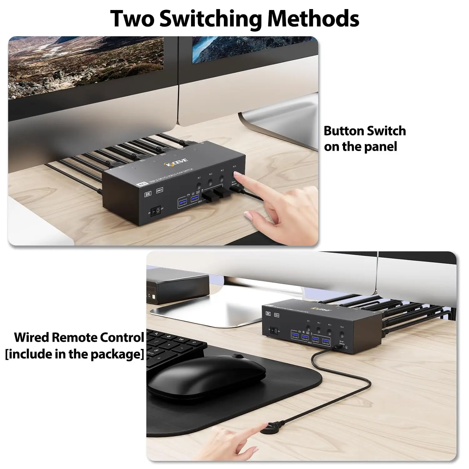 폭넓은 호환성 및 2가지 스위칭 옵션:3개 모니터용 4포트 DP HDMI KVM 스위치는 노트북, 데스크탑, PS5, PS4, Raspberry Pi, DVR 및 Windows, Vista, XP, Mac OS 등과 같은 대부분의 운영 체제와 호환됩니다.유선 리모컨(포함)이나 물리적 버튼을 사용하여 4대의 컴퓨터 간에 전환할 수 있습니다.LED 표시기는 활성 컴퓨터를 명확하게 표시하고 쉽게 전환할 수 있습니다. 작업장에서 더 많은 주문을 할 수 있습니다.