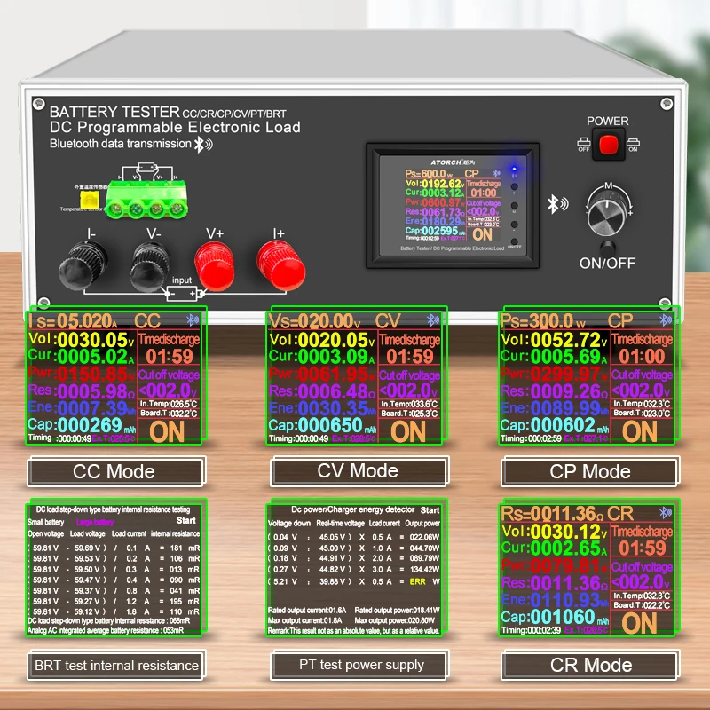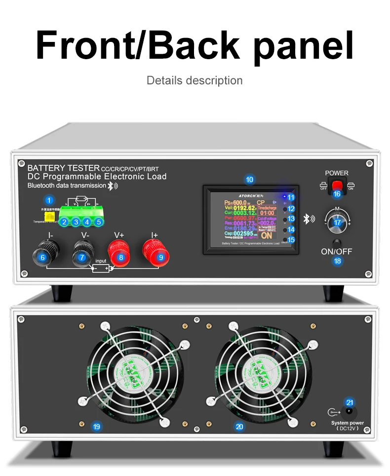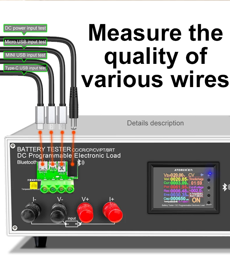 테스터는 다양한 배터리, 18650 배터리, NiMH, NiCd, LiPo, LiFe 및 Pb를 포함한 자동차 배터리의 방전 및 용량 테스트를 위해 설계되었습니다.