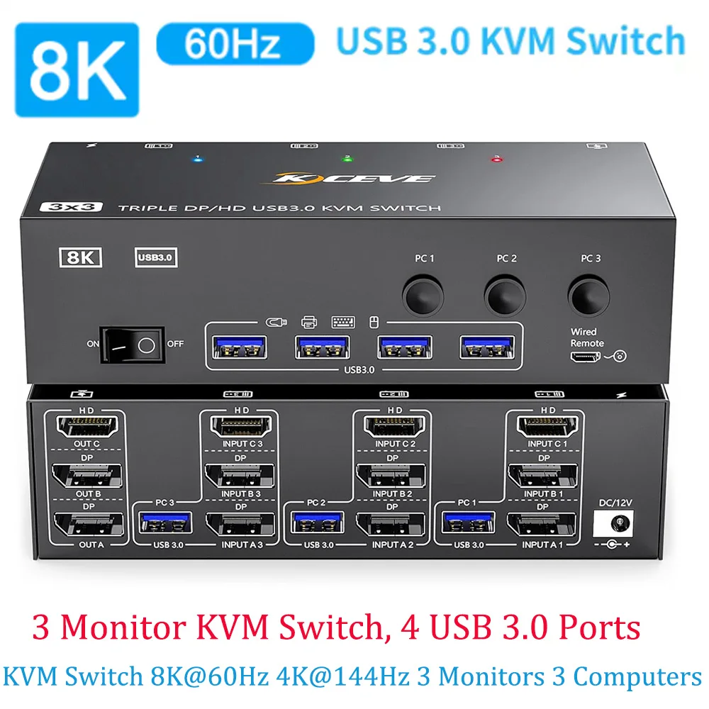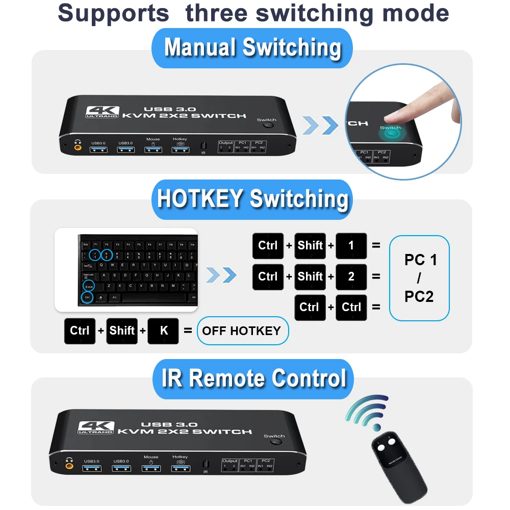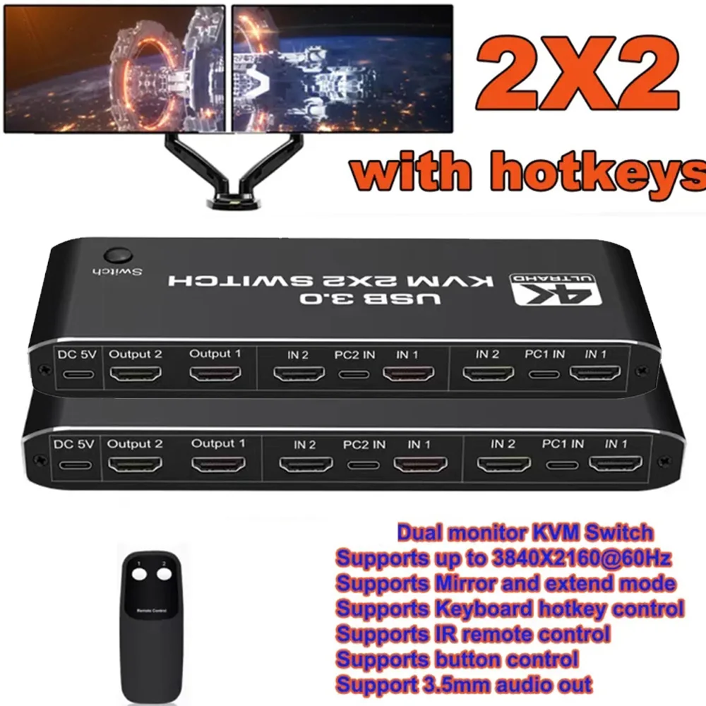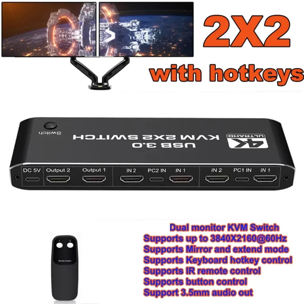 듀얼 모니터 KVM 스위치 2x2 USB3.0 KVM 스위치 2 in 2 out 4K 60Hz 2x2 혼합 디스플레이 PC 노트북용 모니터 2개 컴퓨터