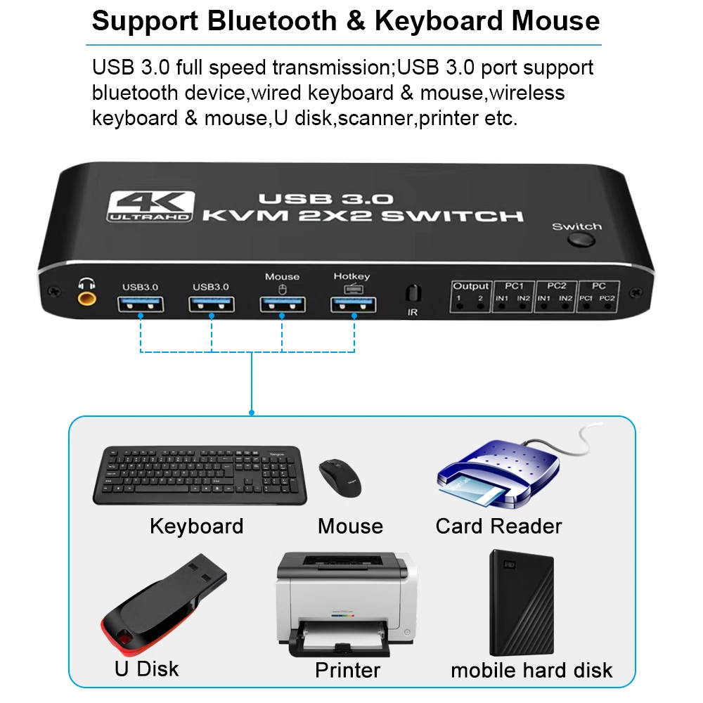 USB 3.0 포트가 있는 듀얼 KVM 스위치: 스캐너/USB 마우스/프린터/모니터와 같은 USB 3.0 포트 장치 연결을 지원합니다.