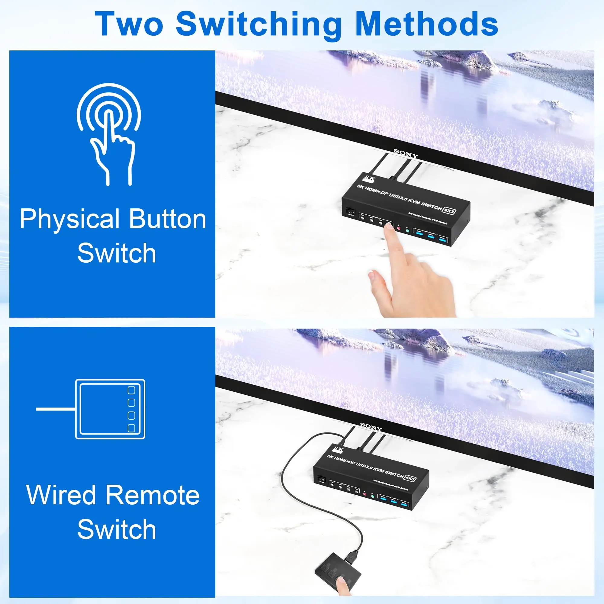 Ultra HD 8K@60Hz 3 모니터 KVM: HDMI 2.1, DP 1.4 트리플 모니터(DisplayPort +HDMI+HDMI) 4포트 kvm 스위치는 최대 8K@60Hz 이하의 해상도를 지원합니다.참고: 최종 해상도는 카드, 모니터, 케이블 및 어댑터에 따라 달라질 수 있습니다.