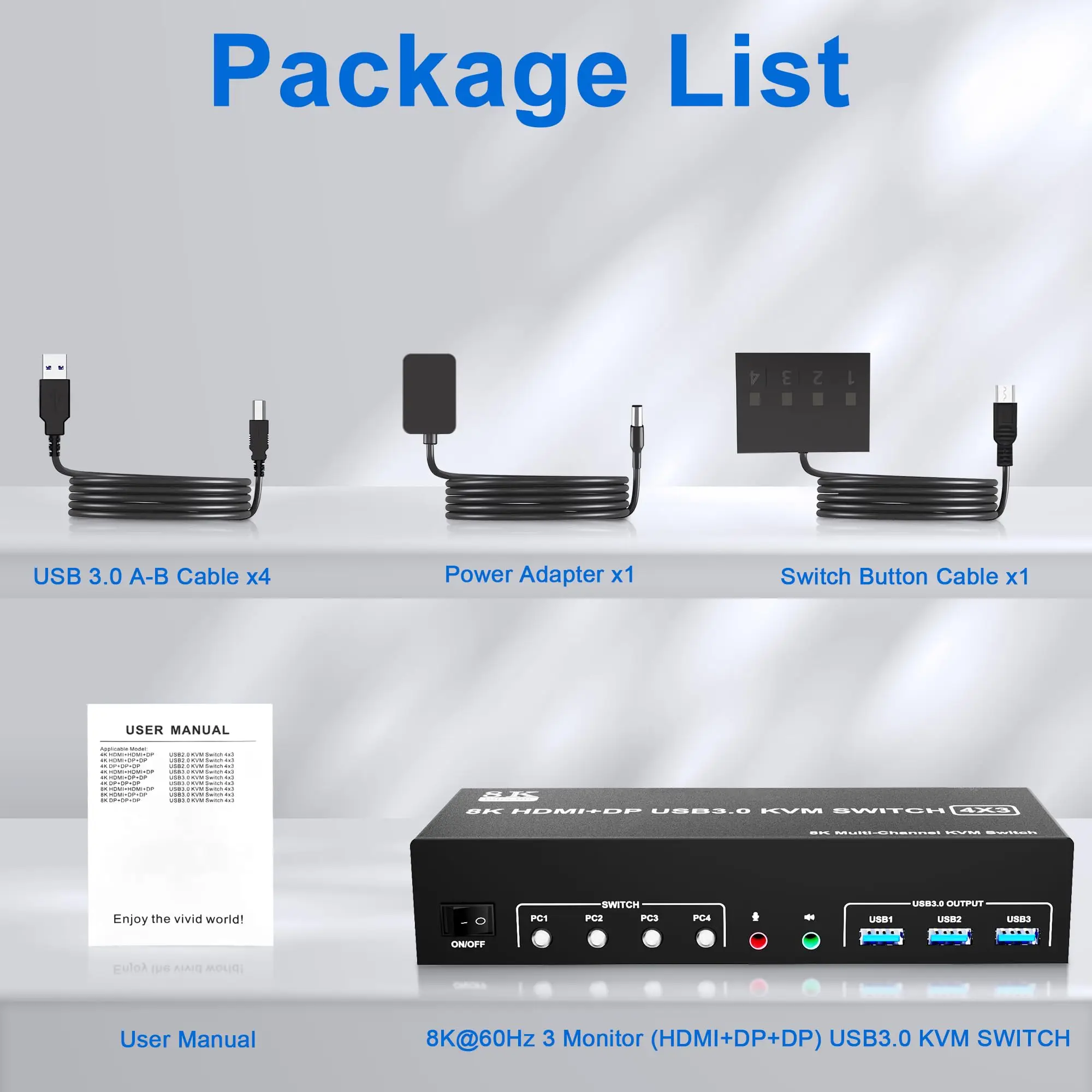 구성품: 8K@60Hz 4포트 USB 3.0 2 HDMI + 1 DisplayPort 트리플 모니터 KVM 스위치 1개, USB 3.0 케이블 4개, POWER LOGIC 어댑터 1개, 유선 버튼 스위치 1개, 사용자 설명서 1개