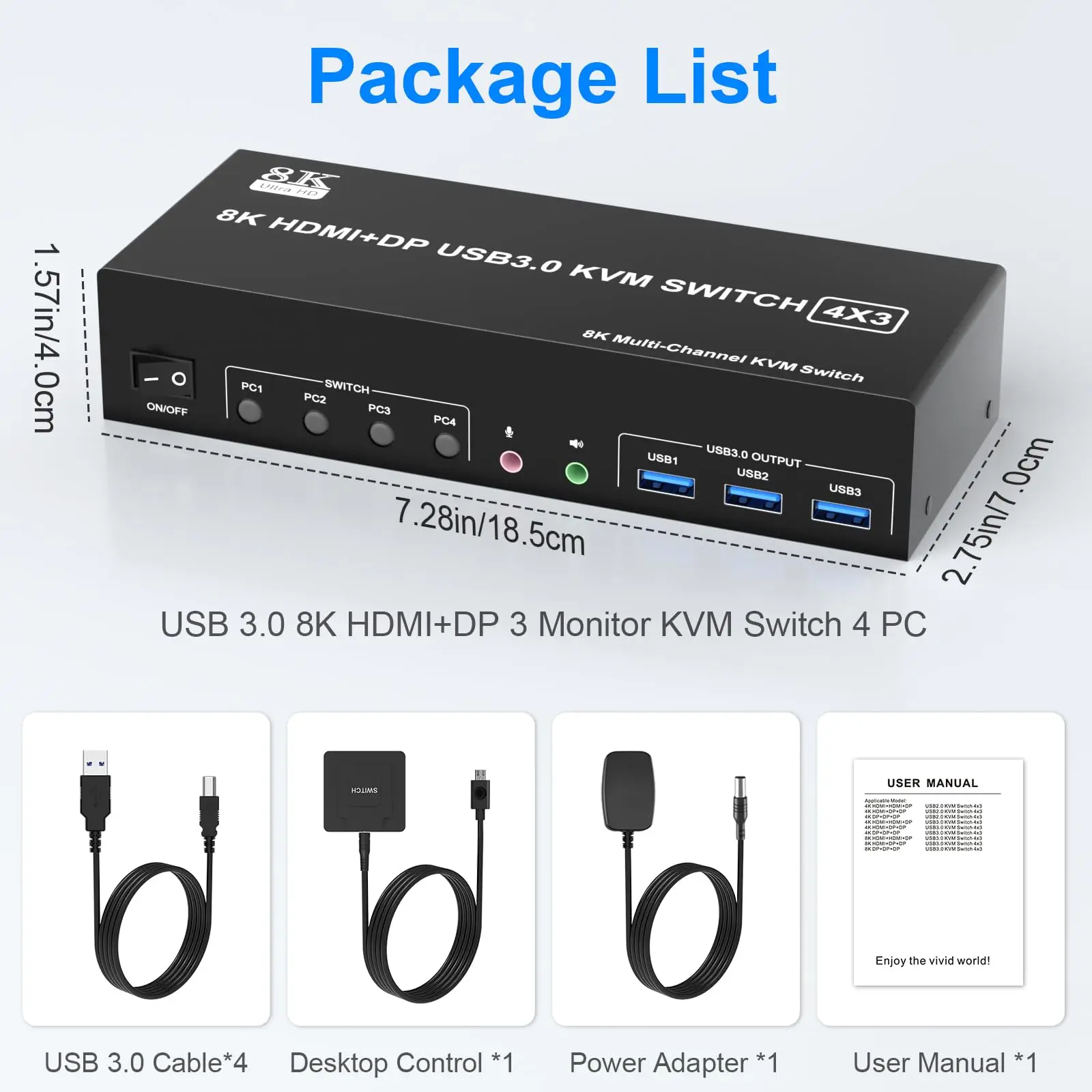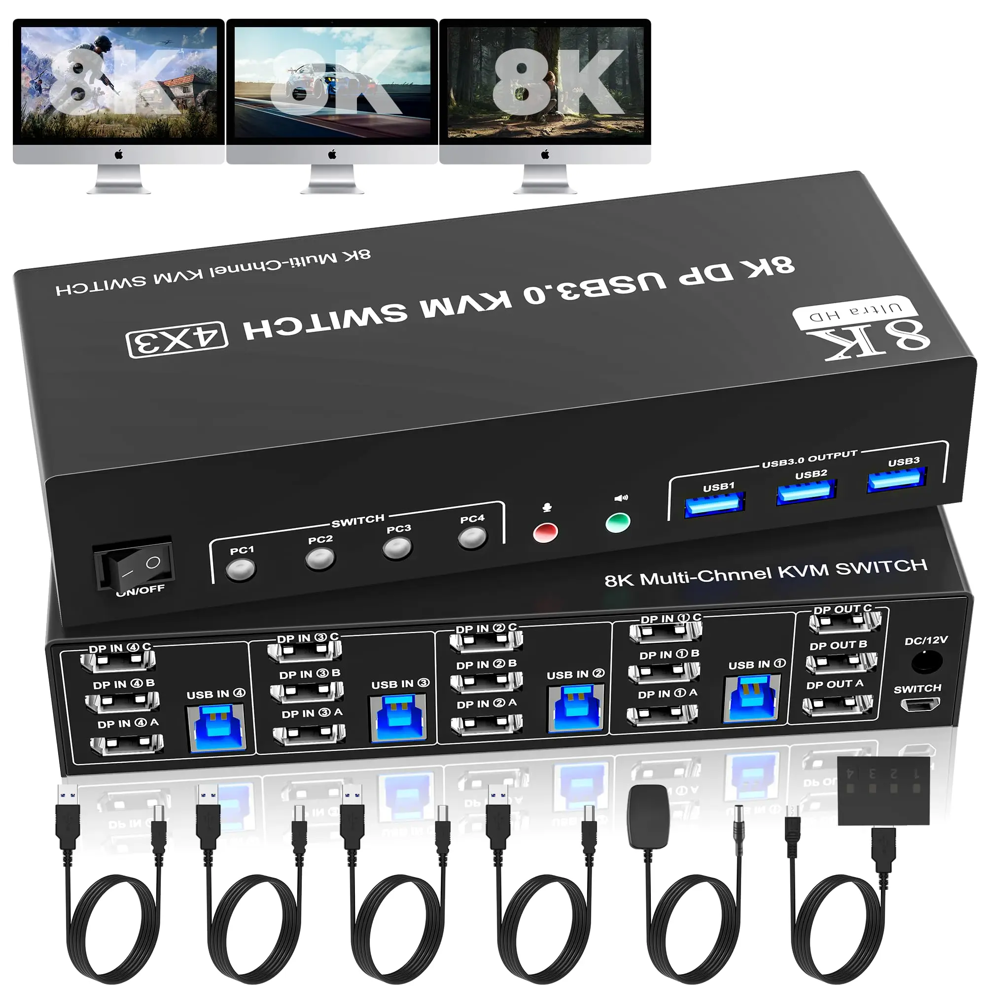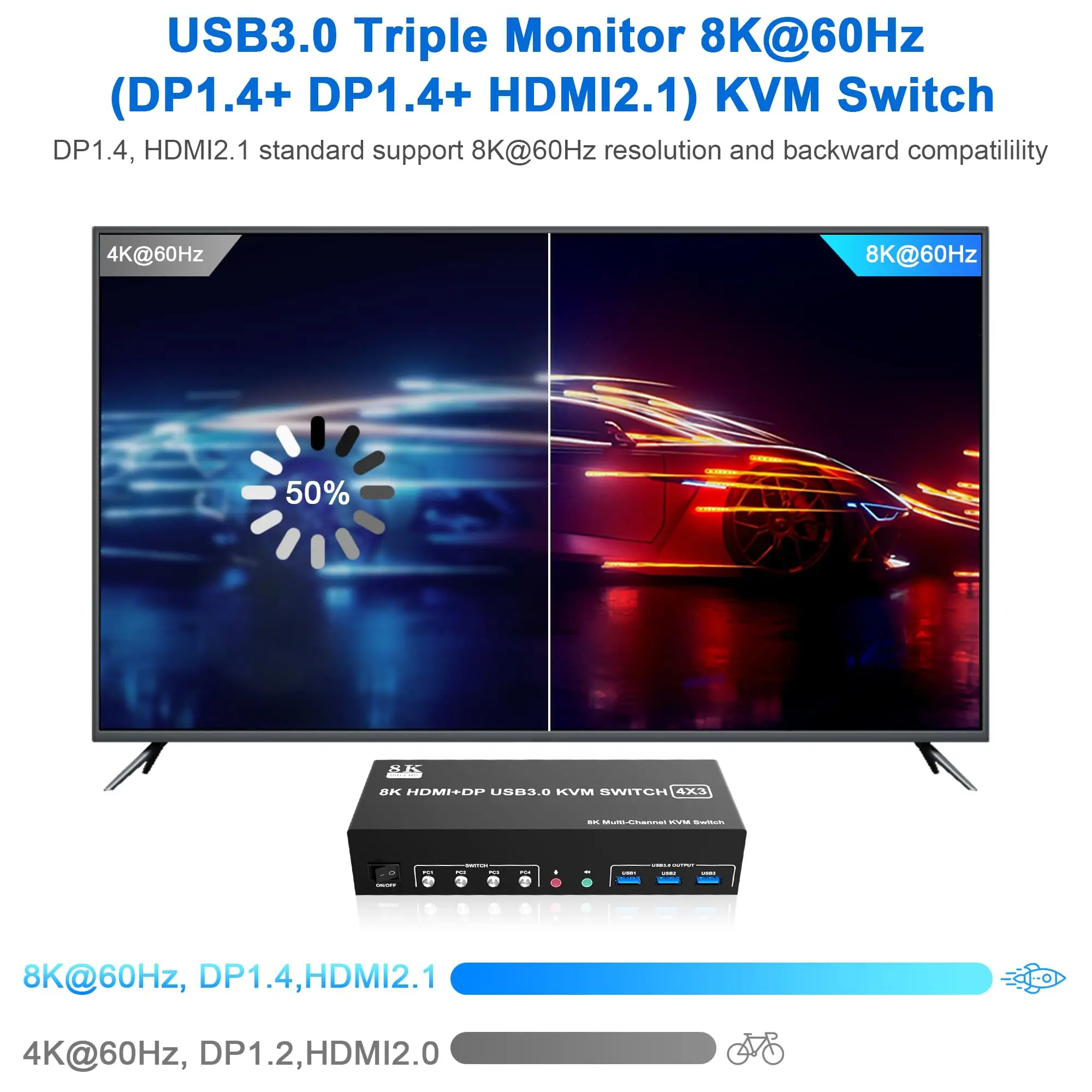 4개 입력 3개 출력 2DP 1HDMI:8K@60HzHDMI+2 DisplayPort 1개모니터 3개 컴퓨터 4개 KVM 스위치, HDMI2.1+DP 1.4 KVM 스위치 4K@144Hz 오디오 및 USB 3.0 포트가 있는 컴퓨터 4개용 트리플 모니터, KVM 트리플 모니터 키보드 마우스 스위처