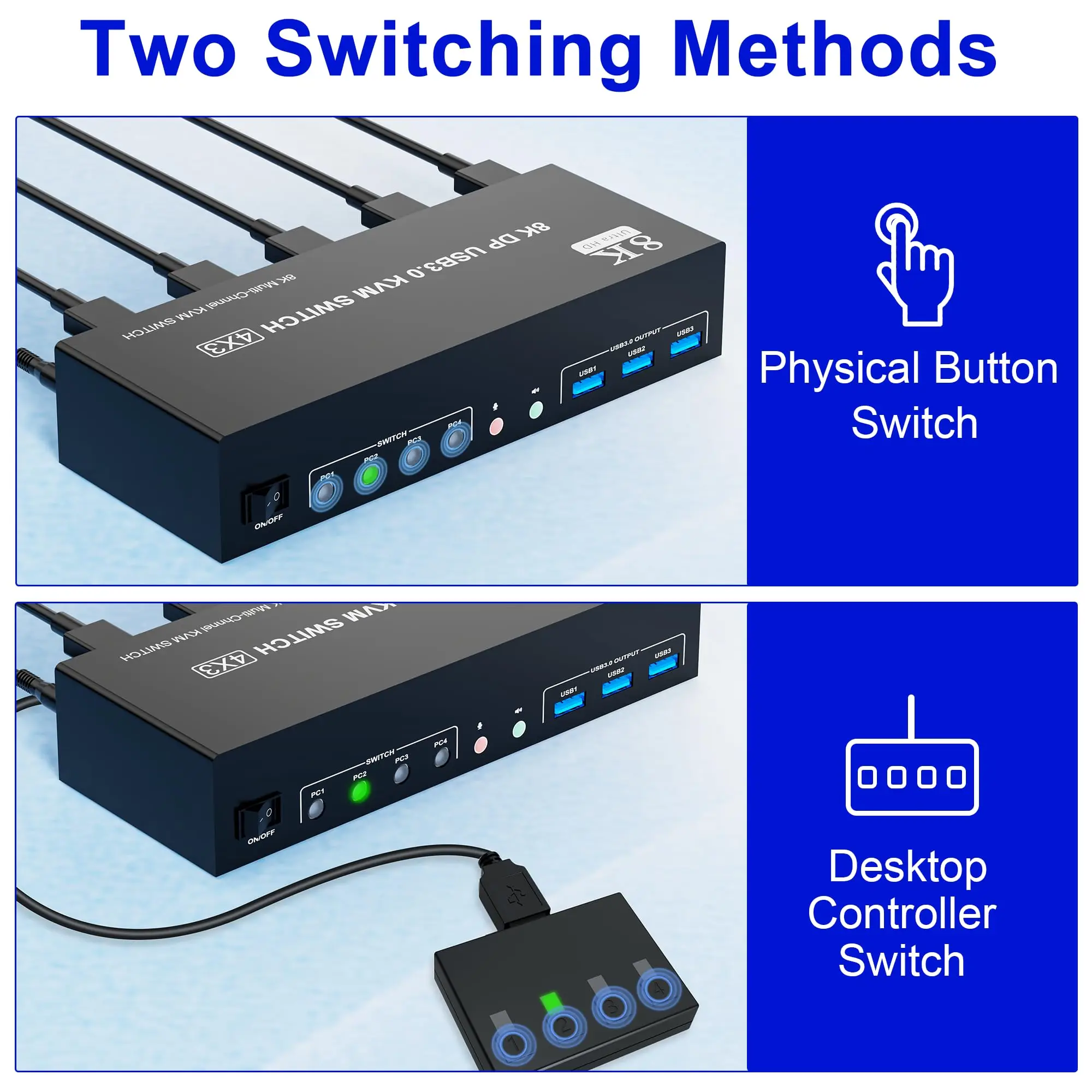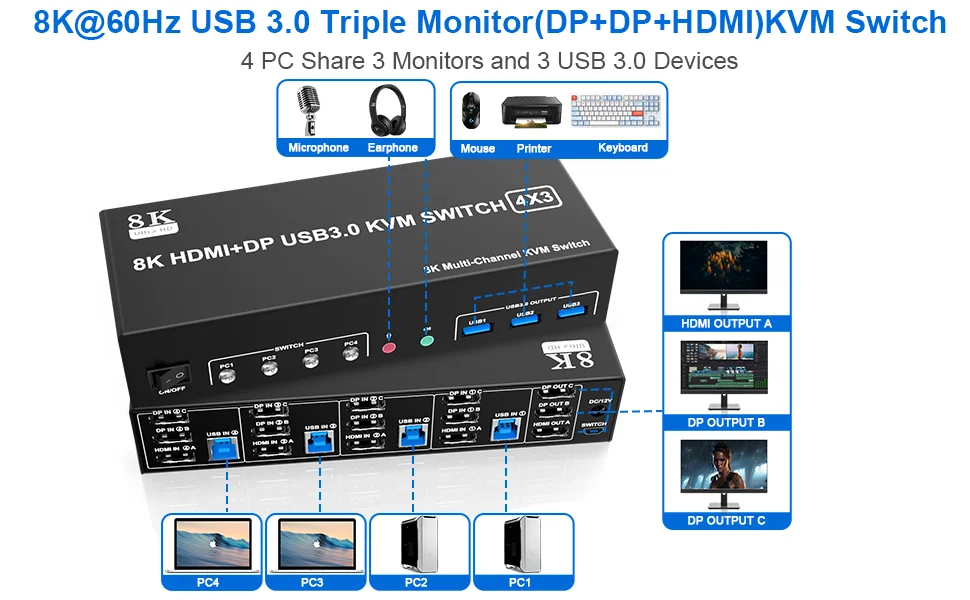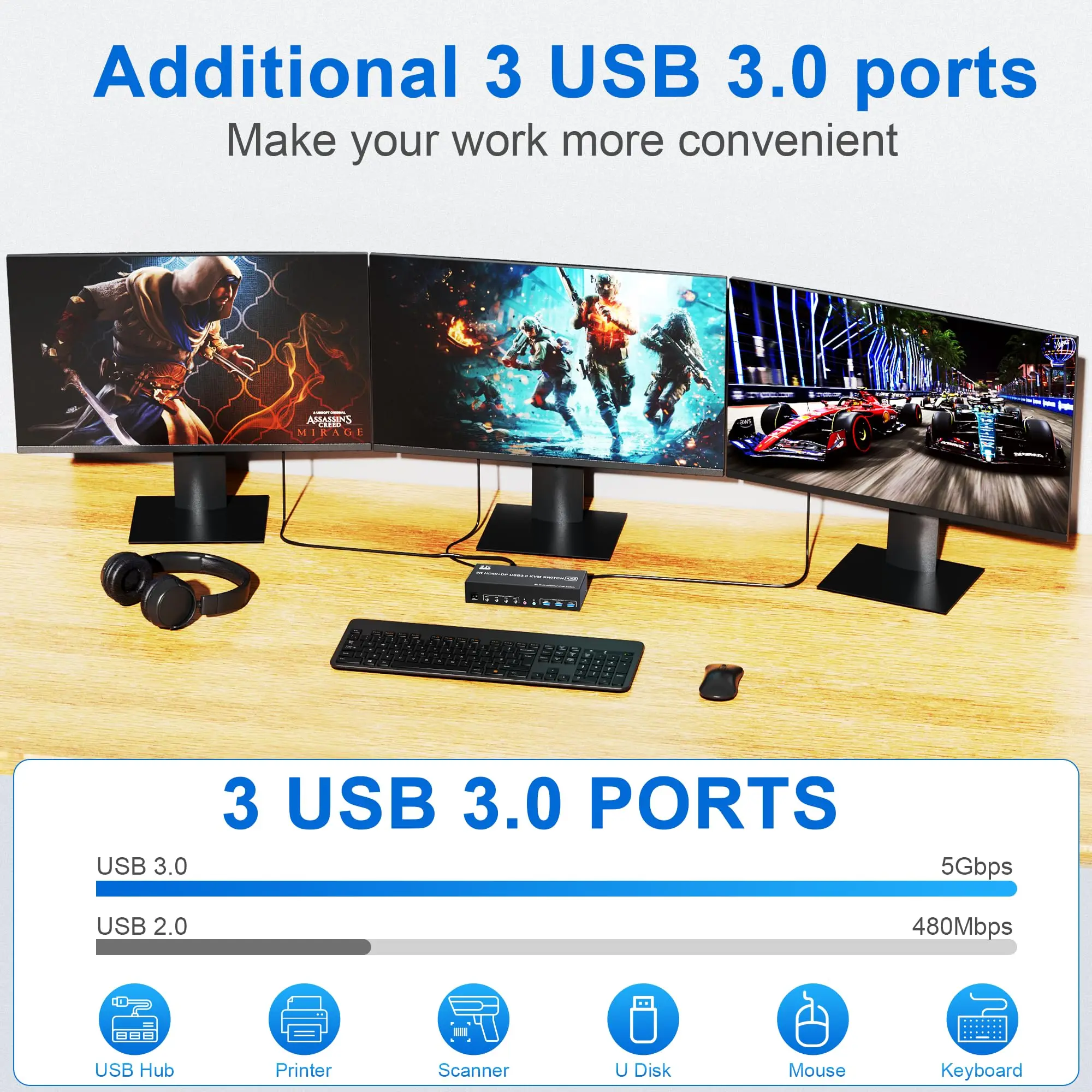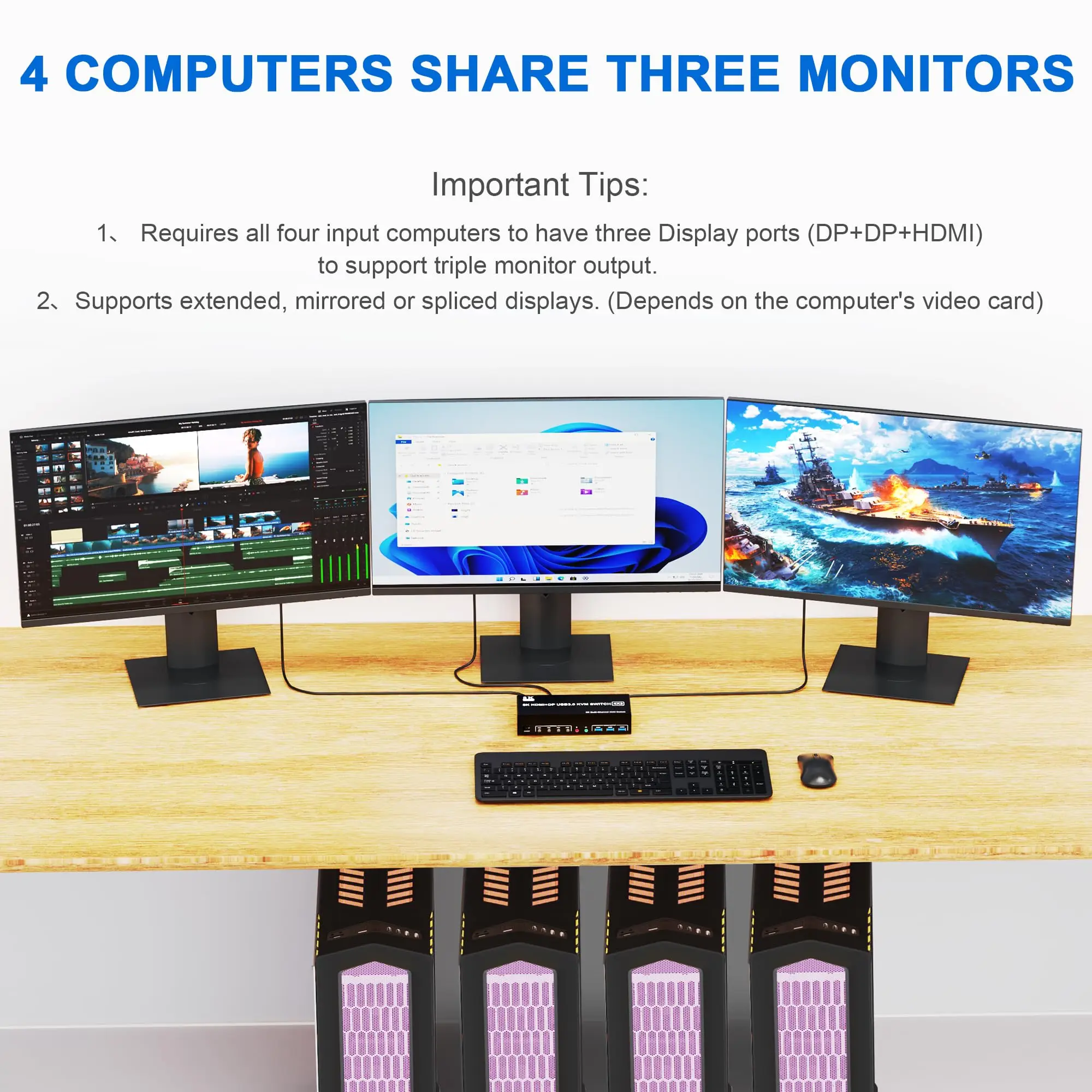 4개 입력 3개 출력 2DP 1HDMI:8K@60HzHDMI+2 DisplayPort 1개모니터 3개 컴퓨터 4개 KVM 스위치, HDMI2.1+DP 1.4 KVM 스위치 4K@144Hz 오디오 및 USB 3.0 포트가 있는 컴퓨터 4개용 트리플 모니터, KVM 트리플 모니터 키보드 마우스 스위처