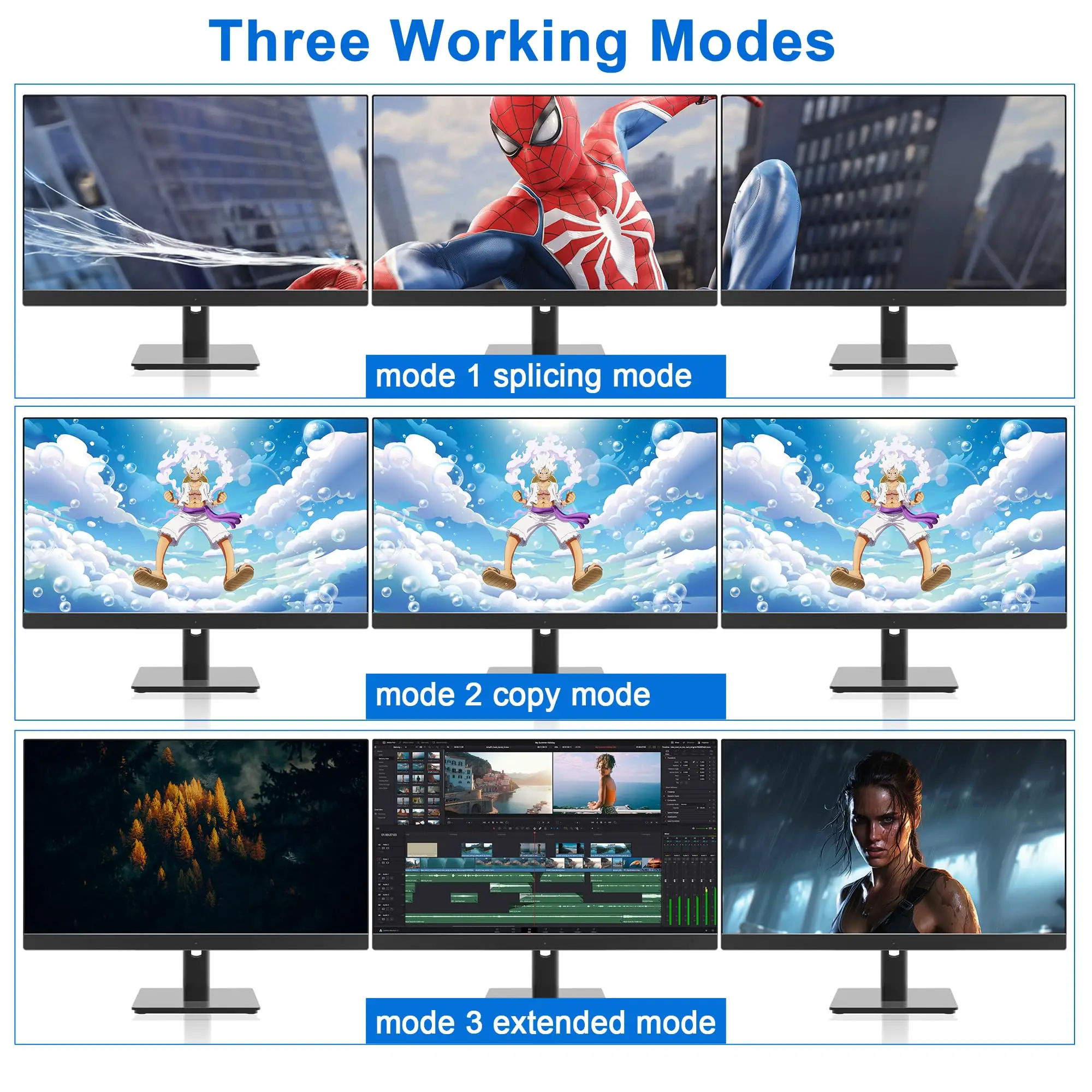 더 많은 선택권 제공: 포트 4개가 있다고 해서 컴퓨터 4대에만 연결할 수 있는 것은 아닙니다.지금은 컴퓨터가 2대 밖에 없지만 앞으로는 3~4대를 사용해야 할 수도 있으므로 이 스위치를 선택하면 됩니다.트리플 모니터 KVM 스위치에는 A, B, C의 세 개의 독립적인 회로 기판이 있으며, 4대의 컴퓨터가 3개의 모니터, 2개의 모니터 또는 1개의 모니터를 공유하는 데 적합하므로 더 많은 선택권을 제공합니다.컴퓨터가 트리플 스크린 디스플레이를 지원하는 것으로 확인되면 3개의 스크린을 사용할 수 있습니다.