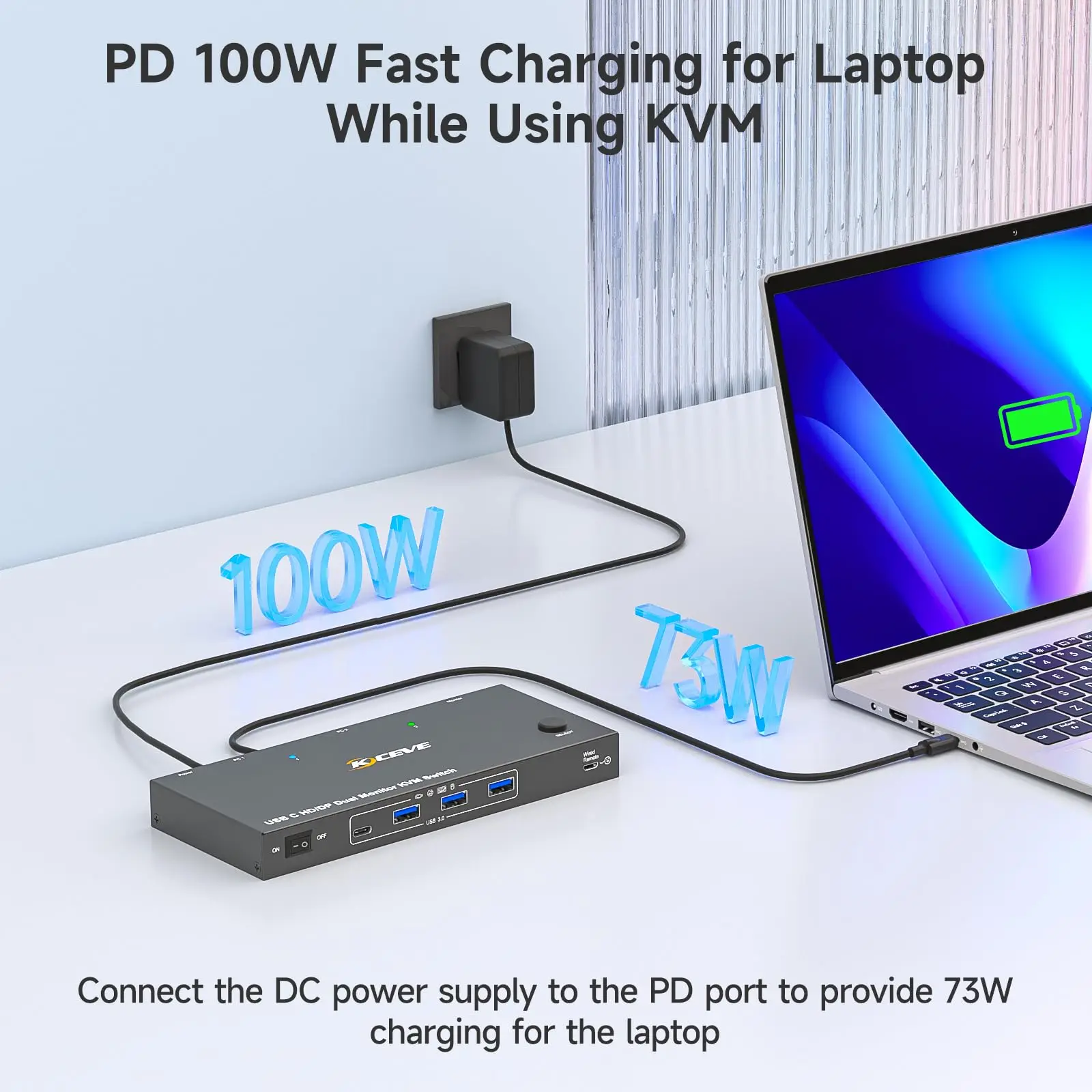 【100W PD 고속 충전 지원】:USBC KVM 스위치에는 PD 충전 포트가 장착되어 작동 중에 노트북에 충분한 전력을 공급합니다.참고: KVM 스위치 자체와 케이블의 전력 손실로 인해 노트북의 실제 충전 전력은 73W에서 85W 사이입니다.KVM 스위치에는 PD 충전 포트가 있어 작동 중에 노트북에 충분한 전력을 공급할 수 있습니다.