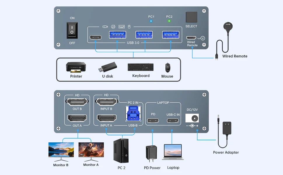 【간편한 전환】: 제어판의 버튼이나 포함된 케이블 리모컨을 사용하여 노트북과 컴퓨터 간을 전환할 수 있습니다.더 쉽게 사용하려면 LED 지침에 따라 컴퓨터를 작동하십시오.포함된 12V DC POWER LOGIC 공급 장치를 연결하십시오.USB C 듀얼 모니터 KVM 스위치로 업무와 홈 엔터테인먼트 간 전환이 편리합니다.참고: 단축키 전환은 지원되지 않습니다.