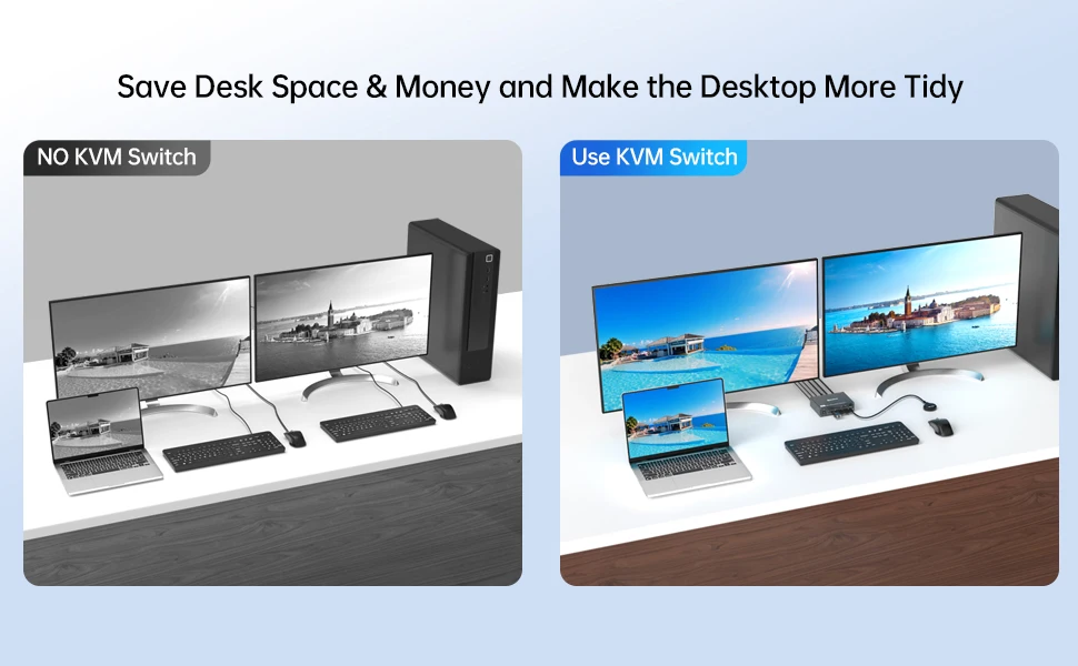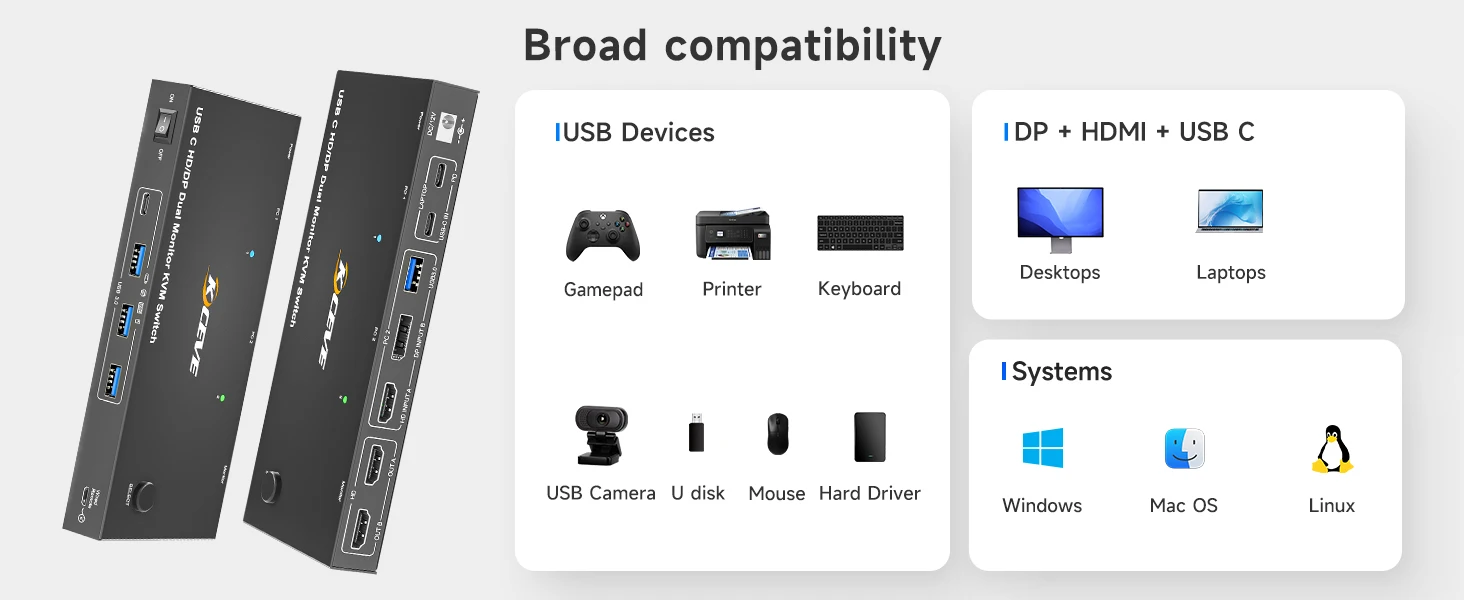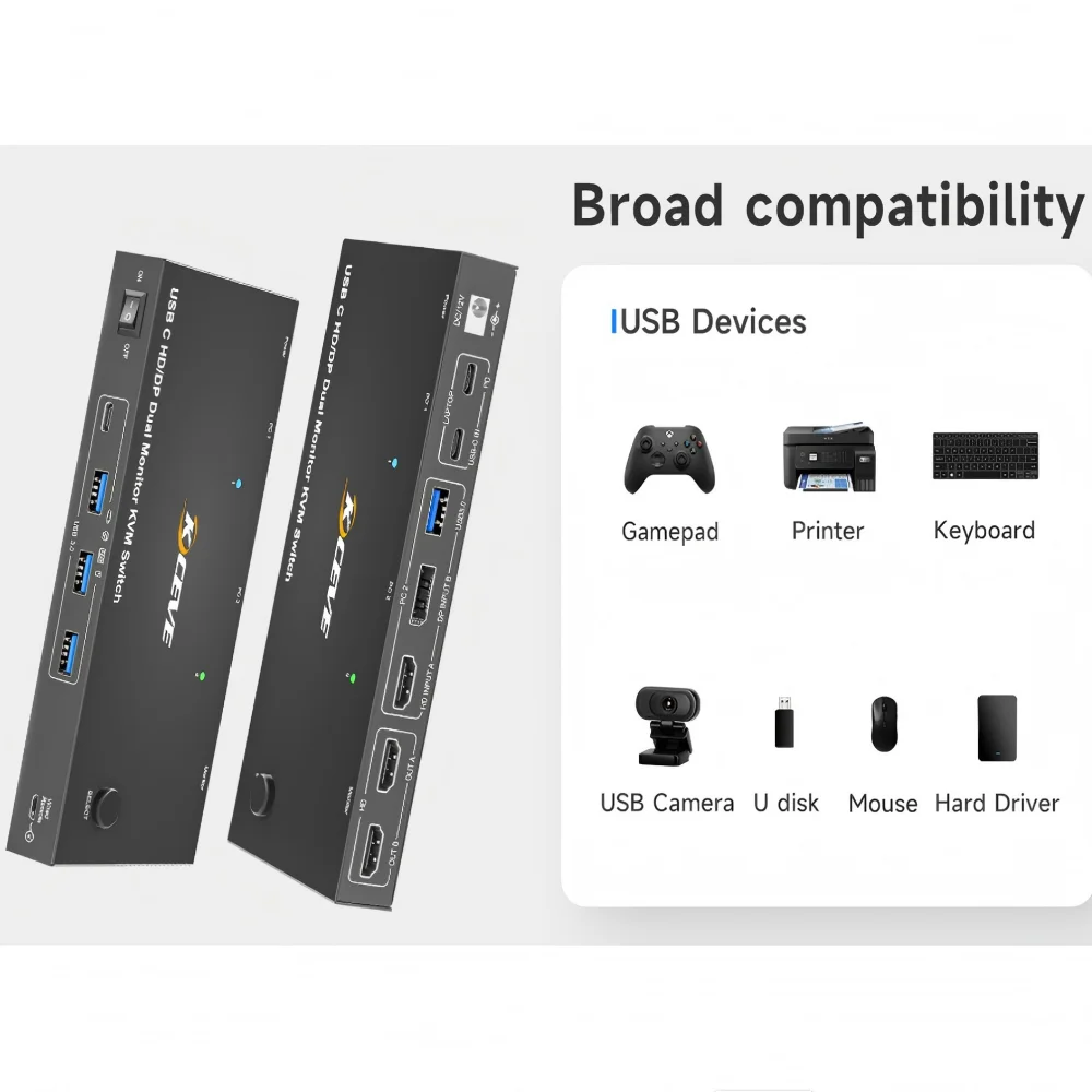 폭넓게 호환 가능:플러그 앤 플레이, 드라이버 설치가 필요하지 않습니다.KCEVE KVM 스위치 USB C HDMI는 Windows, Mac, Linux 및 기타 시스템을 지원합니다.USB C KVM 스위치는 집, 사무실, 게임, 회의 및 기타 장소에서 널리 사용될 수 있습니다.