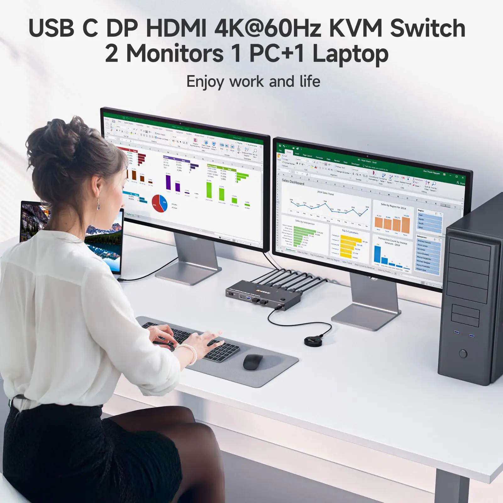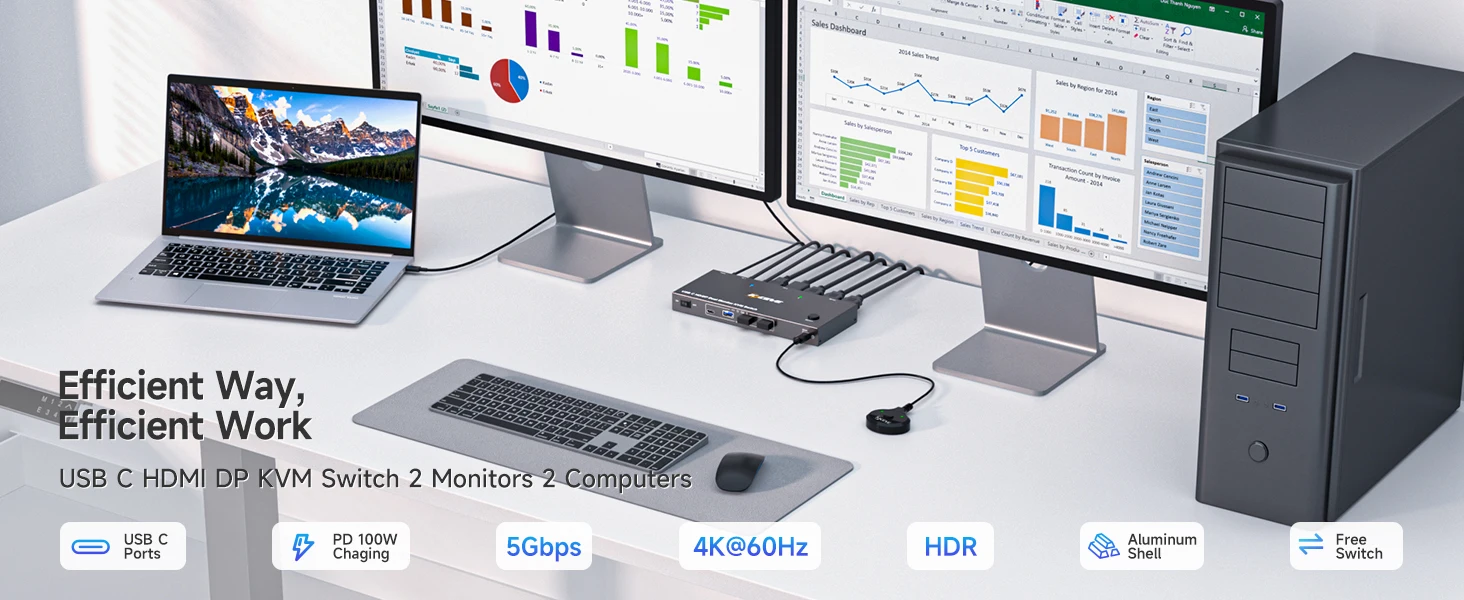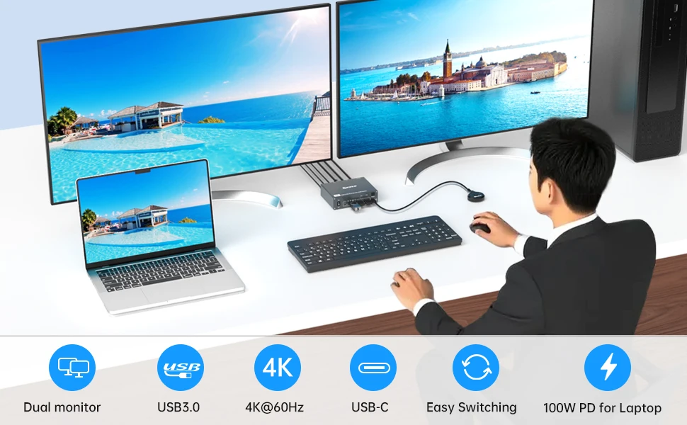 【듀얼 모니터 Type C KVM 스위치】4K HDMI TypeC KVM 스위치 도킹 스테이션은 TypeC 노트북, HDMI 포트 노트북/데스크탑 및 HDMI 장착 모니터를 사용하는 사용자를 위해 특별히 설계되었습니다.KVM을 사용하면 노트북 1대와 데스크탑 1대를 손쉽게 관리하여 모니터 2대와 USB 장치 4대를 함께 공유할 수 있습니다.업무용 PC와 엔터테인먼트 PC 간을 자유롭게 전환하여 사무실과 여가 활동 모두를 충족합니다.